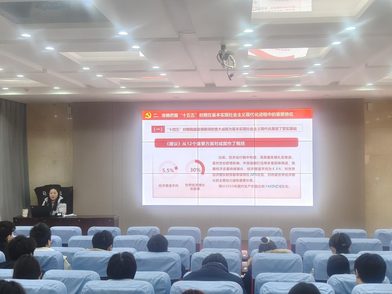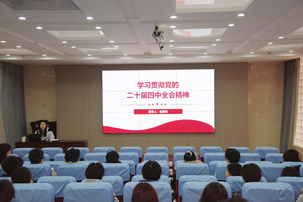 为深入学习宣传贯彻党的二十届四中全会精神,引领团学青年深刻领悟、准确把握全会的重大意义、精神实质和实践要求,切实将思想和行动统一到党中央决策部署上来,根据校团委工作安排,12月30日下午,校团委学习贯彻党的二十届四中全会精神宣讲团成员、数学与统计学院团委书记袁昊姝在我院作专题宣讲。学院团学青年代表共100余人参加活动。