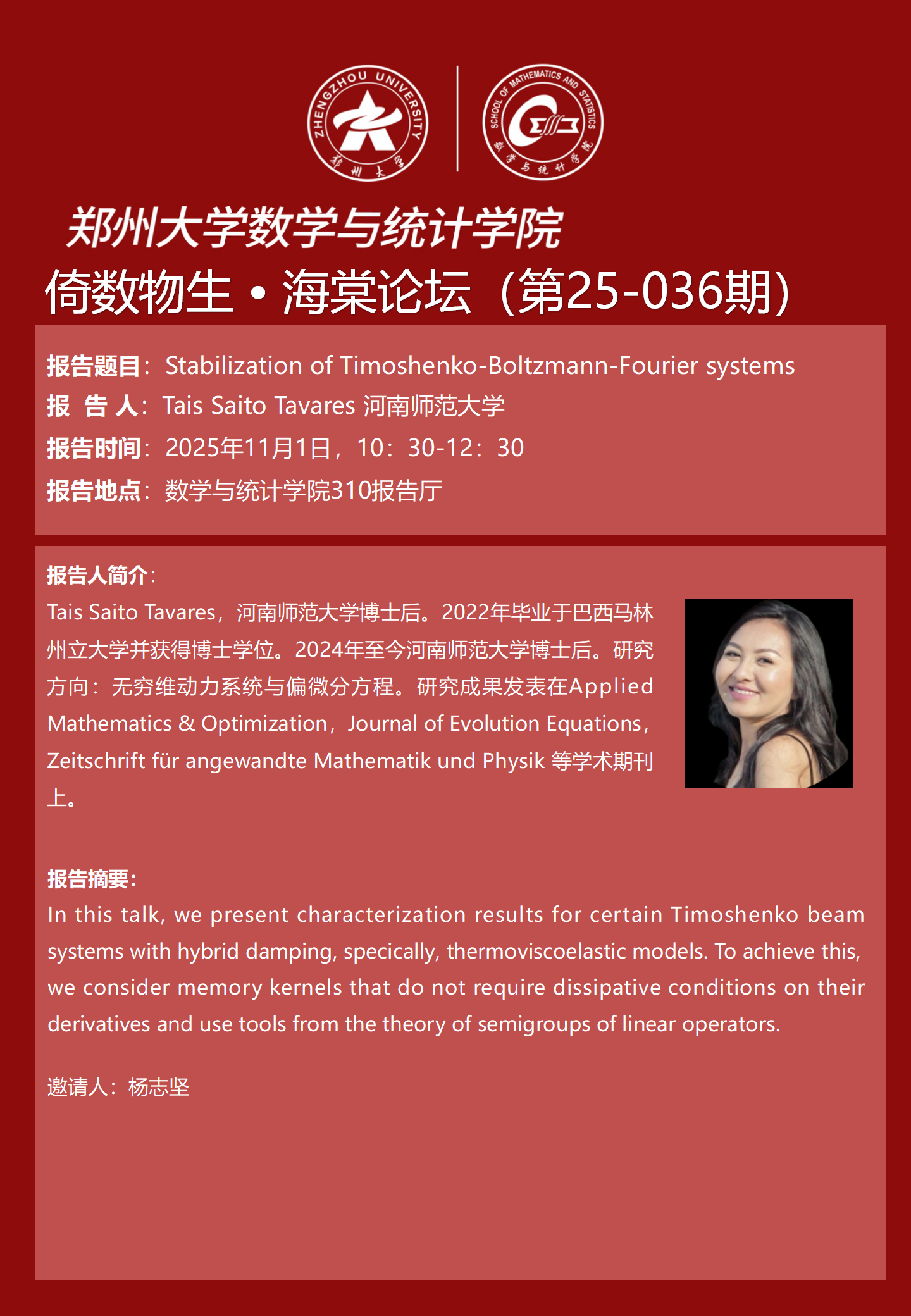 倚数物生·海棠论坛第25-36期《Stabilization of Timoshenko-Boltzmann-Fourier systems》