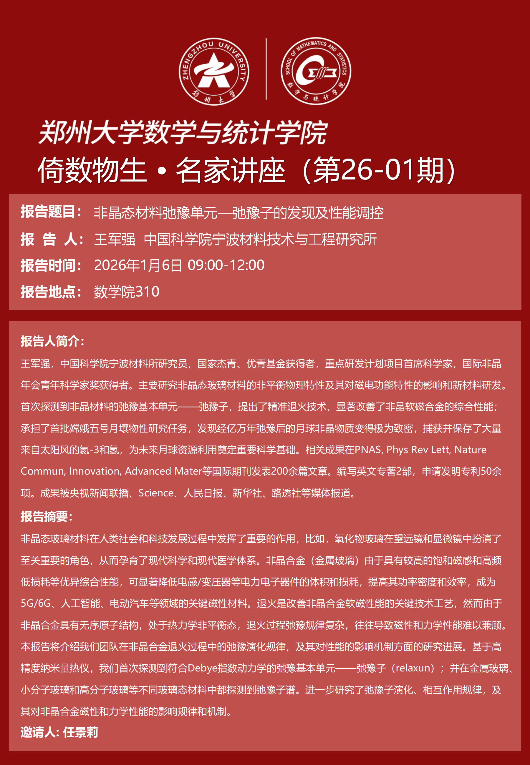 倚数物生·名家讲座第26-01期《非晶态材料弛豫单元—弛豫子的发现及性能调控》