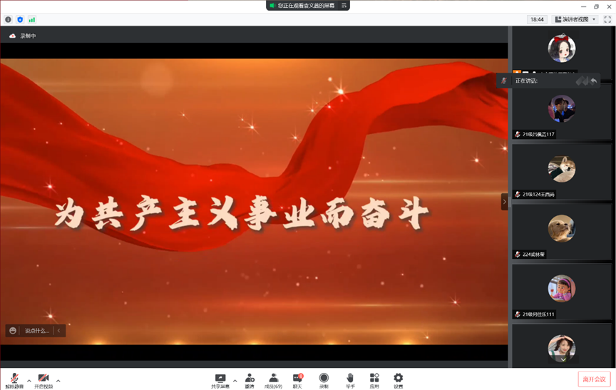 本环节设置与前两个环节相关的知识问答题,同学们可以根据前两个环节中的相关信息直接在会议聊天框中进行问题抢答,率先答对者可获得神秘小奖品一份。该环节通过答题的方式强化广大团员青年的理论基础,促使广大团员青年理论联系实际,积极投入到中华民族伟大复兴的建设当中。