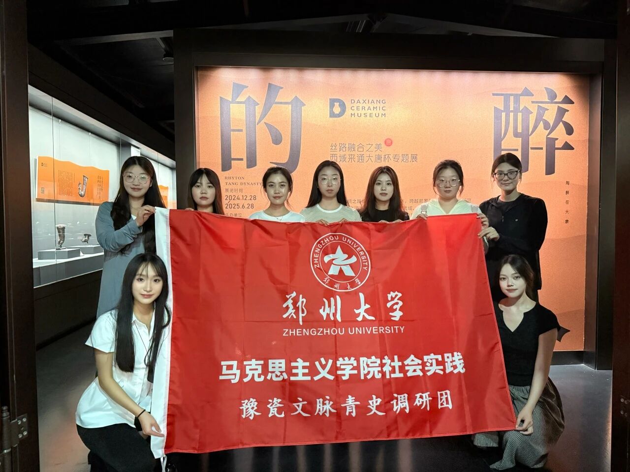 2025年暑假,郑州大学马克思主义学院“豫瓷文脉青史”调研团,以 “豫瓷文脉青史:郑州陶瓷文化的历史谱系探究” 为主题,响应国家文化遗产保护与中华优秀传统文化传承号召。团队由周子菡担任负责人,王诗羽、杜梦然、郝虹玮等 9 名高校相关专业学生组成,成员具备扎实专业基础与较强实践能力。团队深入郑州聚瓷博物馆、郑州大象陶瓷博物馆,通过实地调研馆藏陶瓷器物、考证史料,梳理郑州陶瓷文化发展脉络,挖掘器物历史故事,优化博物馆解说词,设计文化活化方案,为豫瓷文脉当代传承提供实践参考。