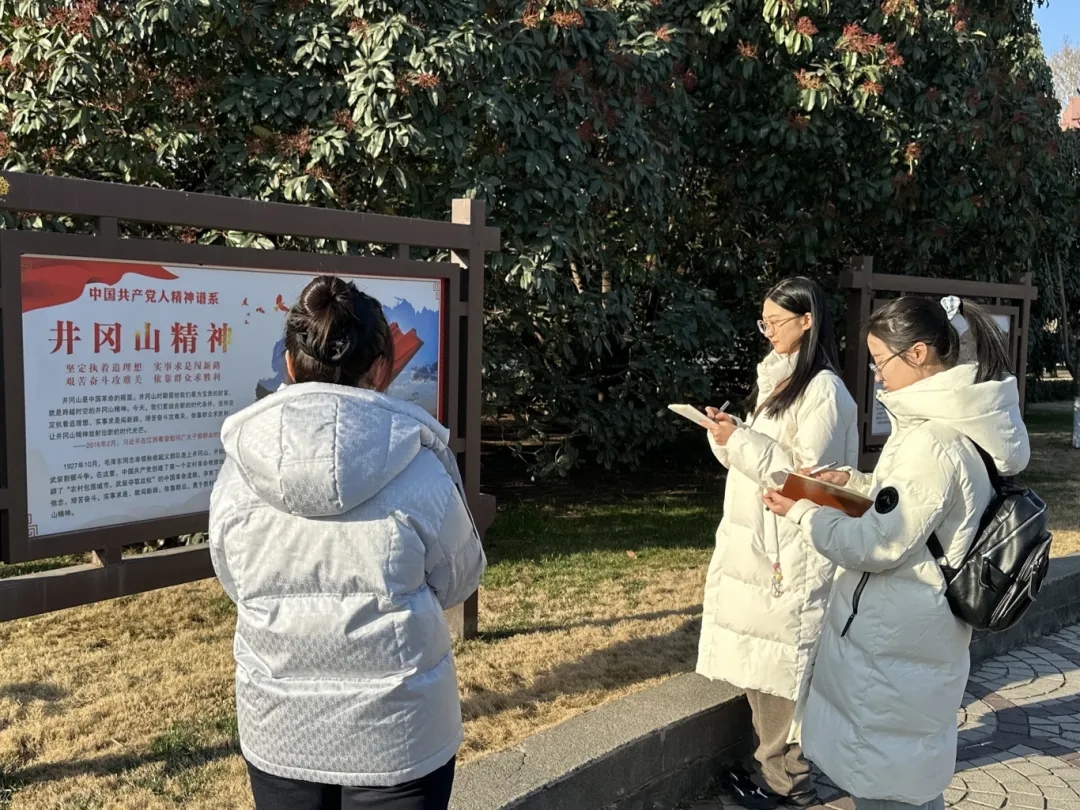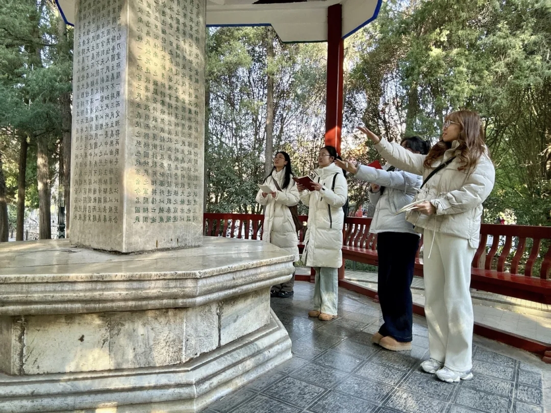 冬日的碧沙岗,苍松翠柏掩映着庄严的纪念碑。这里不仅是市民休闲的公园,更是那段波澜壮阔的北伐革命历史的见证。实践团成员怀着崇敬的心情走进这里,探寻“北伐爱国”的精神内核。在讲解员的引导下,团队成员回顾了那段风云激荡的岁月。每一块碑刻,每一行文字,仿佛都在诉说着当年将士们浴血奋战的故事。在这里,团队成员不仅是在参观,更是在进行一场跨越时空的“访谈”。队员们驻足凝视,试图从历史的遗迹中,解读出先辈们为了国家统一、民族独立而抛头颅洒热血的壮志豪情。碧沙岗的沉静,让团队成员读懂了“忠魂不泯”的真正含义。