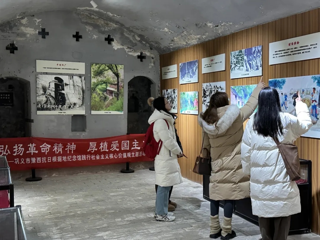 行程的最后一站,团队成员深入柏崖山下,探访位于新密的中原豫西抗日纪念馆。这里曾是皮定均、徐子荣等老一辈革命家运筹帷幄、决胜千里的战场。古朴的窑洞,斑驳的石墙,保留着抗战时期的原貌,团队成员在这里深入了解了豫西军民同心抗敌、保家卫国的峥嵘岁月。