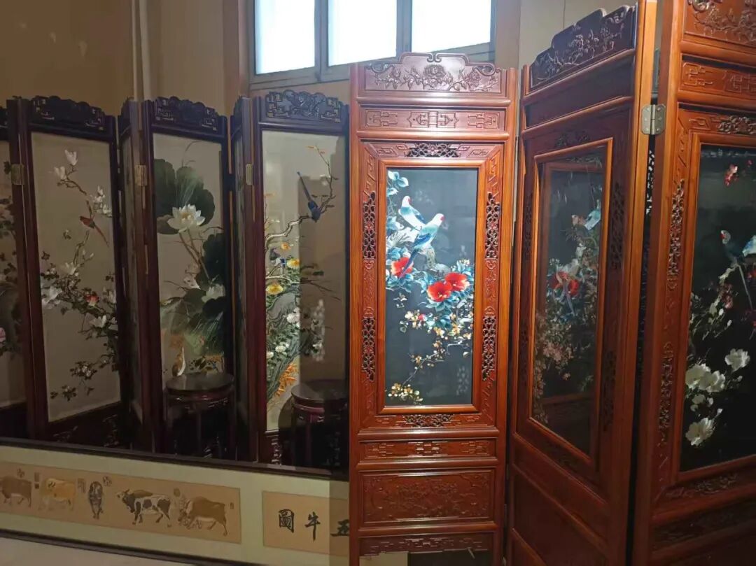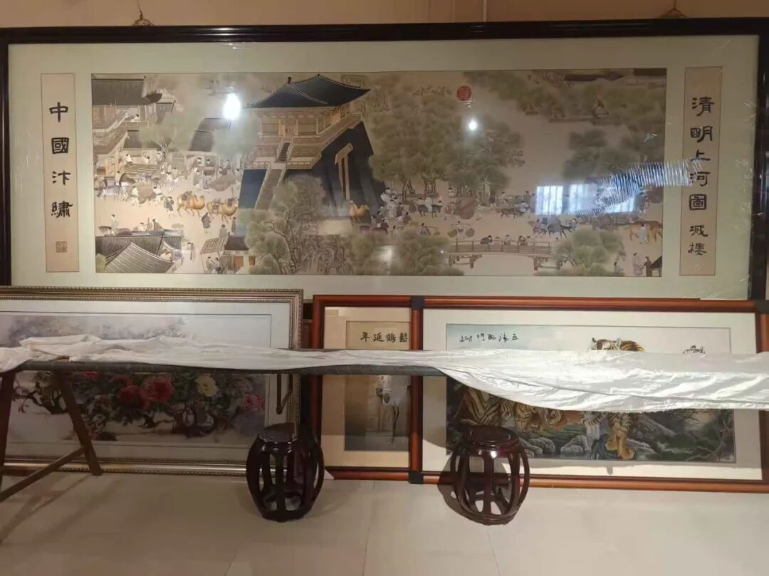 实践期间,团队成员沉浸式参观了博物馆,深切领略了馆藏绣品的匠心与精美。馆内珍藏着王素花老师数十年间绣制、收藏的各类作品数百件,涵盖刺绣、服饰、鞋帽、被面等实用物件,以及人物长卷、绘画精品等观赏佳作,还有名人题词、中国刺绣历史资料、实物图卷及各类获奖作品,全方位展现了汴绣的发展脉络。其中,仿古宋绣精品、巨幅书画绣《清明上河图》《千里江山图》《虢国夫人游春图》等核心展品最为引人注目,针脚细密匀净,色彩雅致灵动,完美复刻了经典画作的神韵,尽显汴绣“平、齐、细、密”的技艺特色,堪称汴绣艺术的集大成之作。