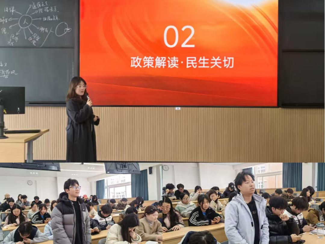 两会精神最终要落地于民生,青年的成长也始终与国计民生息息相关。本环节首先由青年团员对2026年全国两会中与青年密切相关的政策进行梳理和导读,随后开展“青年微分享”活动,鼓励同学们结合自身专业背景和生活观察,围绕“教育公平”“就业优先”“科技创新”“社会保障”等热点议题,踊跃发表个人见解。