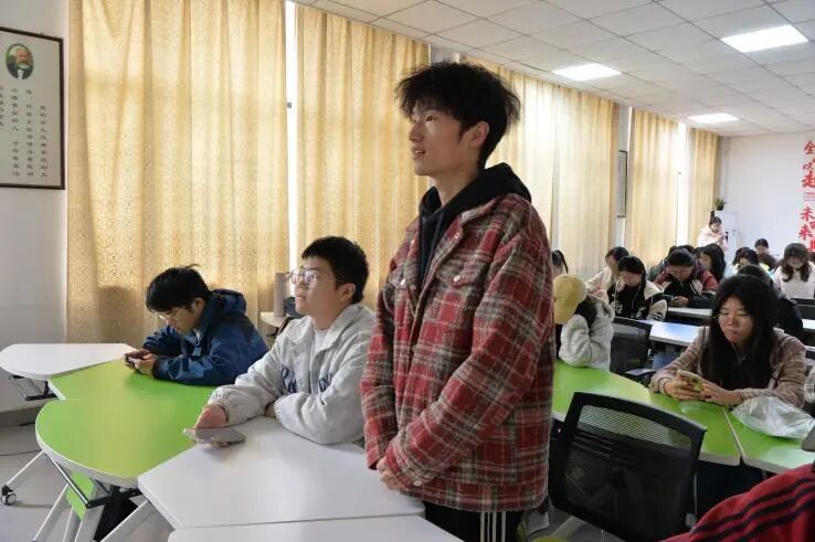 “热词邂逅·思维碰撞”环节则充满了青春的参与感与思维的乐趣。同学们通过抽取“热词盲盒卡”,化身为“新质生产力”、“十五五”规划等两会关键词的“临时解读员”。大家结合屏幕资料与自身理解,踊跃分享对这些时代“密码”的认知。这种互动方式,让政策术语变得可触可感,在轻松的分享与聆听中实现了知识的互补与深化,真正使理论学习“活”了起来。