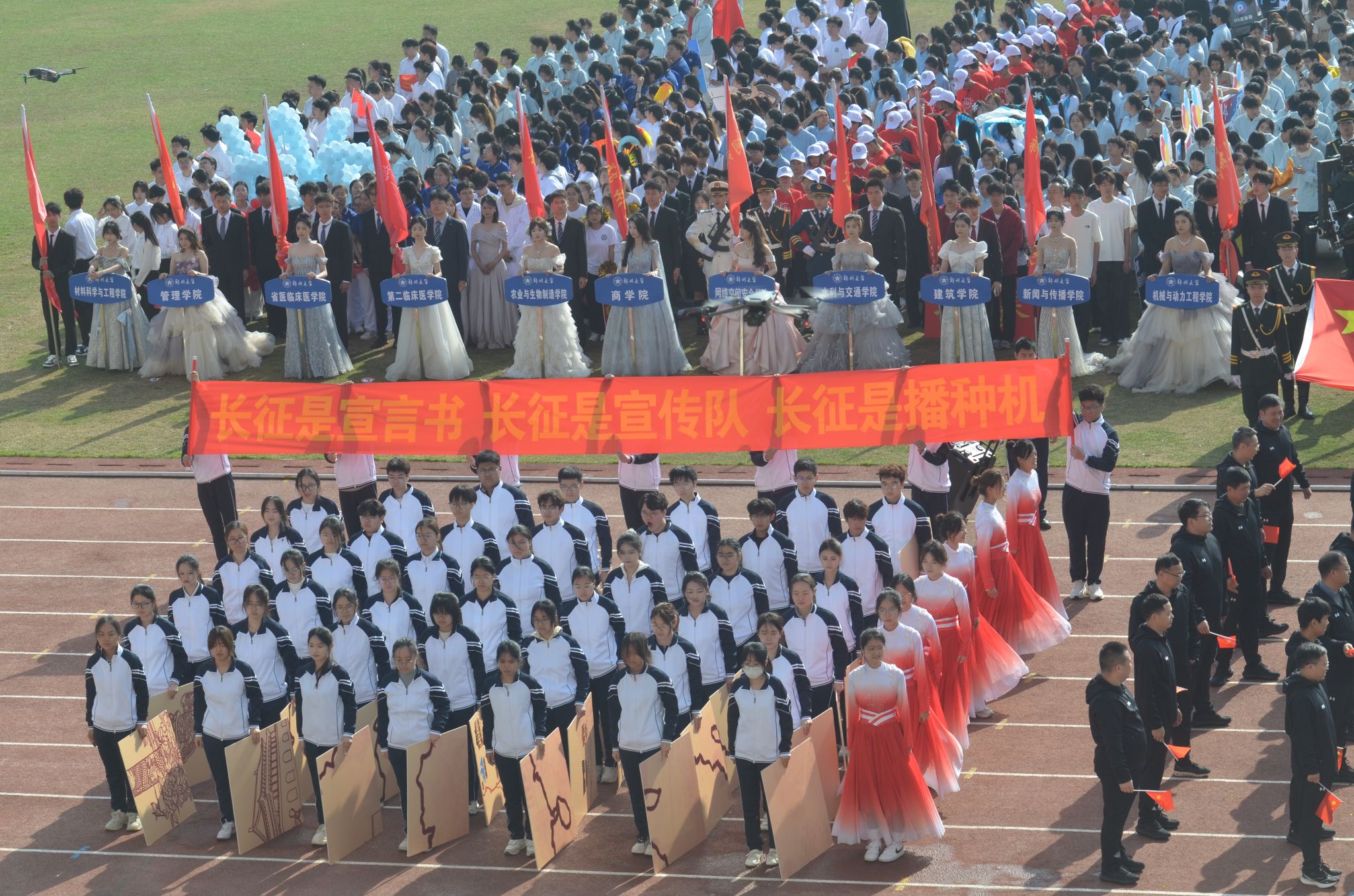 领队优雅引领,旗手高举院旗阔步前行,两名护旗手身姿挺拔、紧随身旁。教师方阵步履沉稳,尽显育人初心与信仰担当。队伍中段,舞蹈小队伴着《七律·长征》的悠扬旋律,以青春舞姿缅怀革命岁月,以身体语言传承长征精神。学生方阵整齐列队,手持KT板拼接成红军长征路线图,定格那段峥嵘征程。方阵后方,“长征是宣言书,长征是宣传队,长征是播种机”的横幅徐徐展开,字字千钧,气贯长虹。