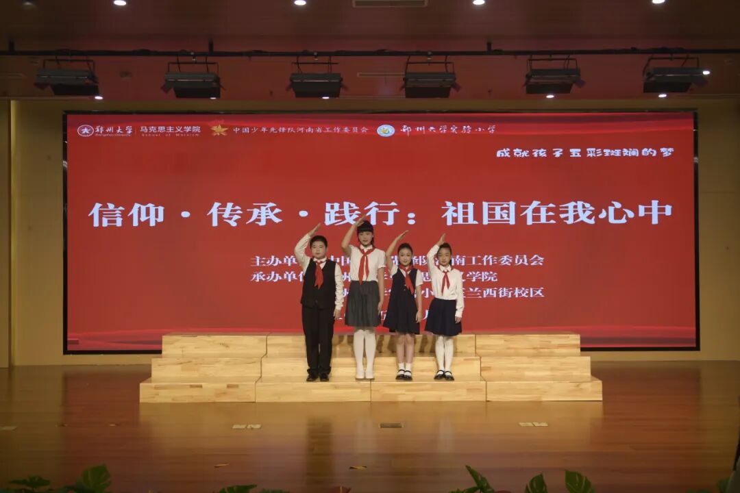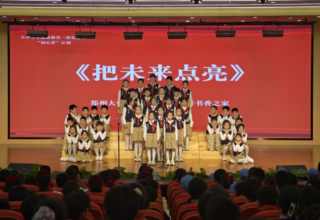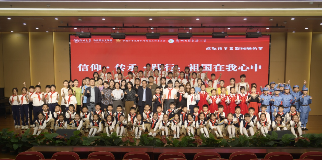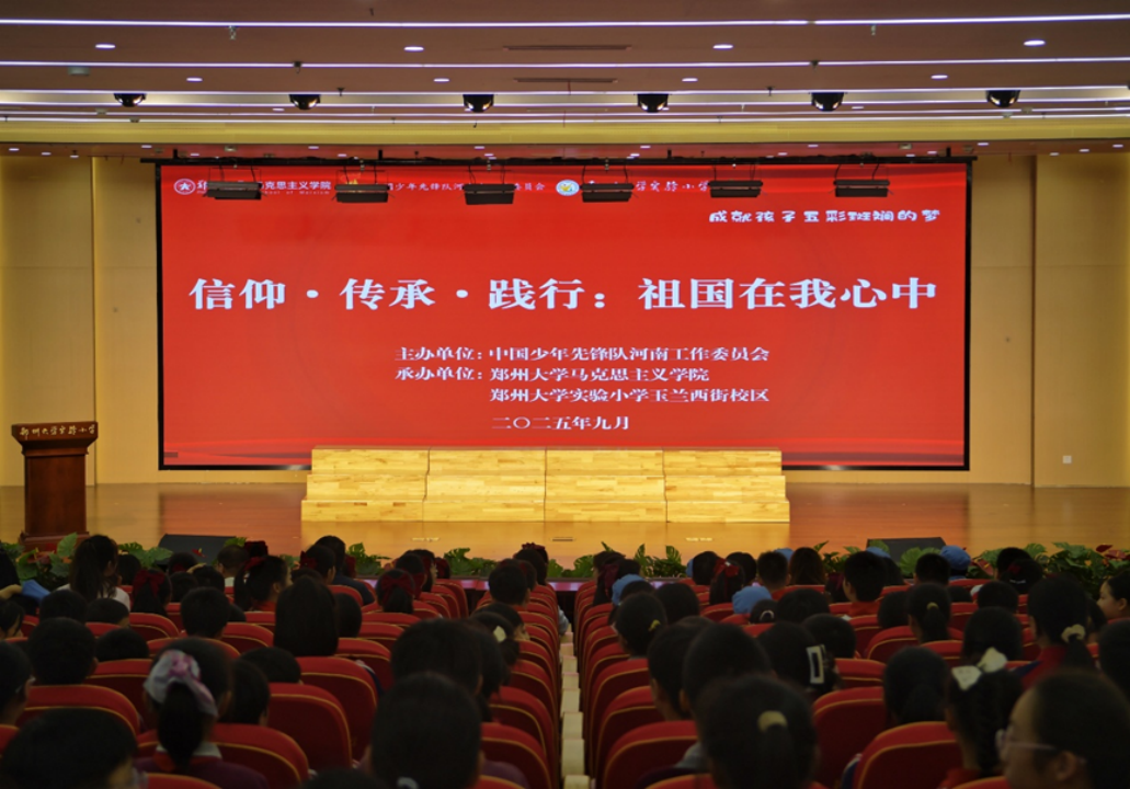 2025年9月25日,教育部大中小学思政课一体化共同体(河南)品牌项目“初心芽”计划主题宣讲活动在郑州大学实验小学玉兰西街校区举行。活动以“祖国在我心中”为主题,由郑州大学马克思主义学院(共同体牵头高校)联合中国少年先锋队河南省工作委员会、新乡市少年先锋队工作委员会和郑州大学实验小学共同举办。郑州大学马克思主义学院党委副书记高昂、郑州大学河南音乐学院党委副书记贾琳、郑州大学马克思主义学院副院长任中义、郑州大学实验小学玉兰西街校区副校长孙海姣、郑州大学马克思主义学院大中小学思政教育一体化建设办公室主任郑丹群以及来自大中小学的师生代表和相关单位负责人共300余人参加活动。活动由郑州大学实验小学玉兰西街校区学生成长部主任吴周利主持。