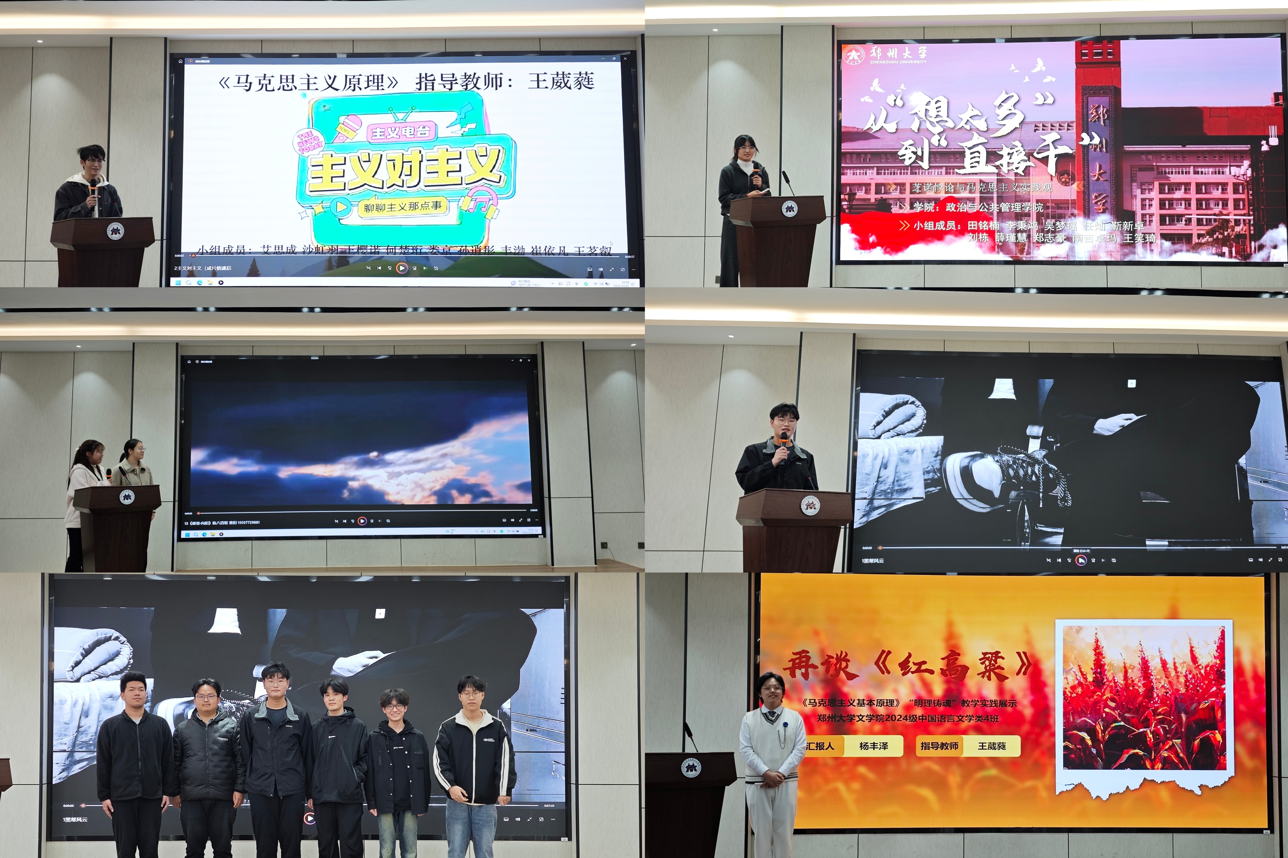 本次活动经过班级初选、教师推荐和教研室评审,最终评选出十三部作品进行现场展示。这些作品主题鲜明、内容丰富、形式多样,涵盖理论宣讲、社会观察、情景剧演绎、短视频创作等多种类型,聚焦反诈、综艺、直播、短剧等热门话题,将马克思主义基本原理与现实问题紧密结合。展示过程中,各小组代表依次上台,通过PPT演示、现场讲解、情景再现等方式生动地呈现实践成果。现场互动频繁、气氛热烈。总体来看,十三个小组的作品都坚持了马克思主义的立场、观点和方法,紧密联系实际,展现了当代大学生的创新精神和实践能力。