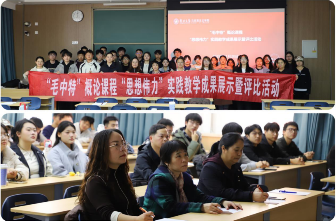 为深化思政课实践教学,检验学生感悟马克思主义中国化时代化真理光芒与思想伟力的成效,11月20日,2025年秋季学期“毛中特”概论课程“思想伟力”实践教学成果展示暨评比活动成功举办。“概论”教研室主任蒋桂芳主持活动,活动邀请“原理”教研室王霞教授、“纲要”教研室岳红琴副教授、李自强博士及“概论”教研室教师代表等作为评委,参赛学生团队参加活动。