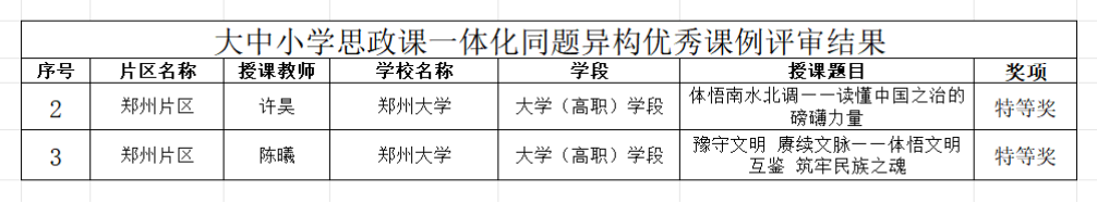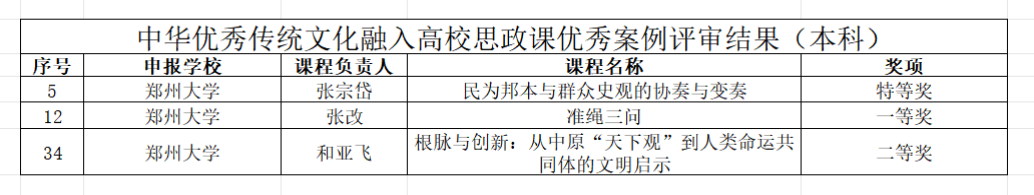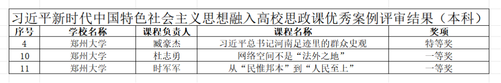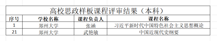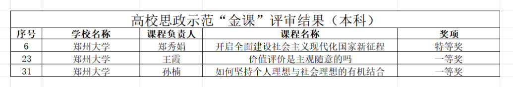 以张涵为负责人的“习近平新时代中国特色社会主义思想概论”课程团队和以武艳敏为负责人的“中国近现代史纲要”课程团队获批高校思政样板课程;郑秀娟获高校思政示范“金课”特等奖,王霞、孙楠获高校思政示范“金课”一等奖;臧豪杰获习近平新时代中国特色社会主义思想融入高校思政课优秀案例特等奖,杜志勇、时军军获习近平新时代中国特色社会主义思想融入高校思政课优秀案例一等奖;张宗岱获中华优秀传统文化融入高校思政课优秀案例特等奖,张改获中华优秀传统文化融入高校思政课优秀案例一等奖,和亚飞获中华优秀传统文化融入高校思政课优秀案例二等奖;许昊、陈曦获大中小学思政课一体化同题异构优秀课例特等奖。