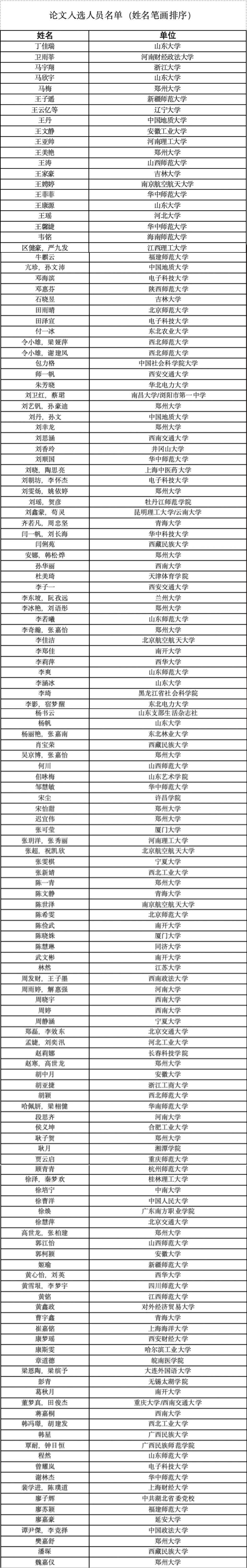 “第四届中国化时代化马克思主义理论教育教学暨大中小学思政课一体化建设研讨会”自征稿启事发布至截稿日期,得到全国高校的广泛关注和积极响应,共收到投稿论文480多篇,经专家评审,选出参会论文144篇。会务组将安排工作人员通过邮箱与入选论文作者联系,通知后续事宜,请注意查看投稿邮箱,并于3月15日前填写参会回执。现将入选稿件名单公布如下: