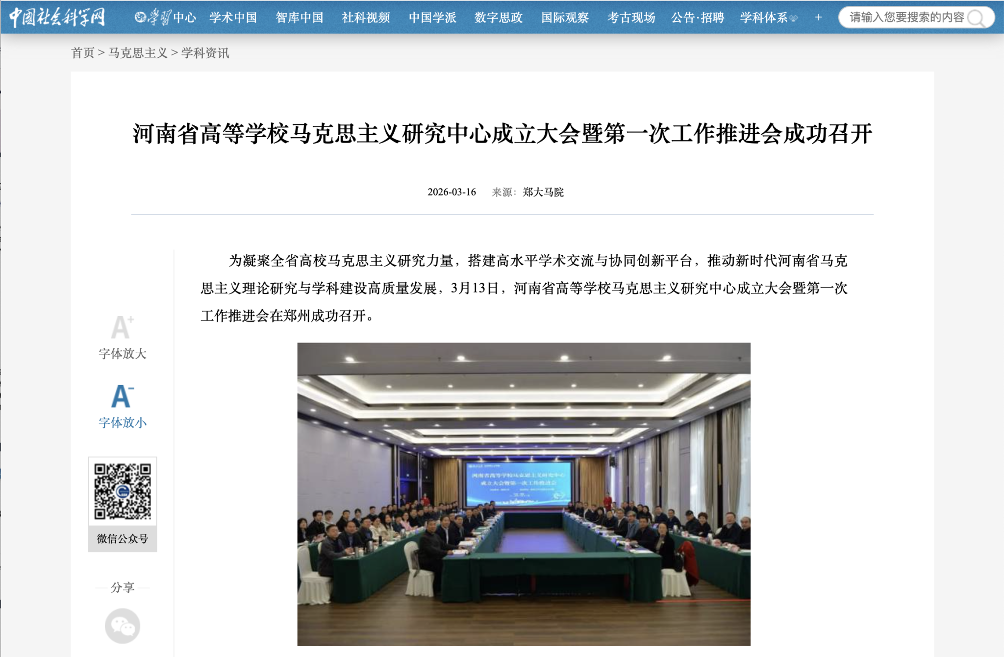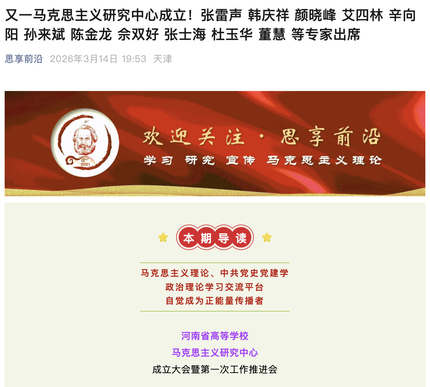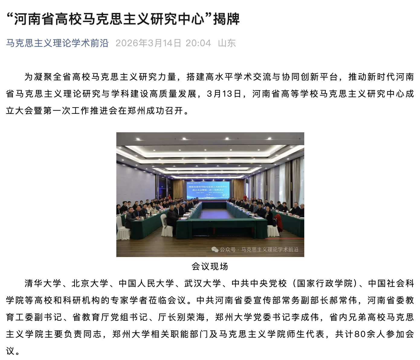 为凝聚全省高校马克思主义研究力量,搭建高水平学术交流与协同创新平台,推动新时代河南省马克思主义理论研究与学科建设高质量发展,2026年3月13日,河南省高等学校马克思主义研究中心成立大会暨第一次工作推进会在郑州成功召开。来自清华大学、北京大学、中国人民大学、武汉大学、中共中央党校(国家行政学院)、中国社会科学院等高校和科研机构的的专家学者莅临会议。本次活动被河南高教、中国社会科学网、党建网、人民号、思享前沿公众号等多家主流媒体报道。