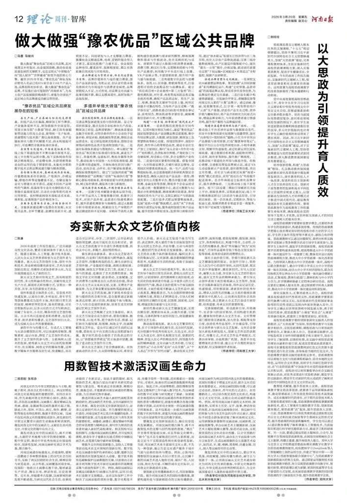 编者按:近日,《河南日报》理论版刊发学院教师荆玲玲理论文章《以大思政为引领提升育人质效》。本文立足 “十五五” 规划纲要与政府工作报告相关部署,强调当前国际局势和多元价值下加强高校 “大思政课” 建设的重要性,从构建 “大思政课” 格局、深化实践育人、数智技术赋能三方面,阐述高校提升思政育人质效的路径:创新教学理念激发学生创新思维,推进大中小学思政课一体化建设;融合思政小课堂与社会大课堂,挖掘红色文化等资源开展实践教学,汇聚育人合力;运用数智技术创新教学模式,搭建数字化平台、打造网络思政阵地,推动思政课教学数字化智能化转型,落实立德树人根本任务,助力教育强国建设。现予全文转发,供大家学习参考。