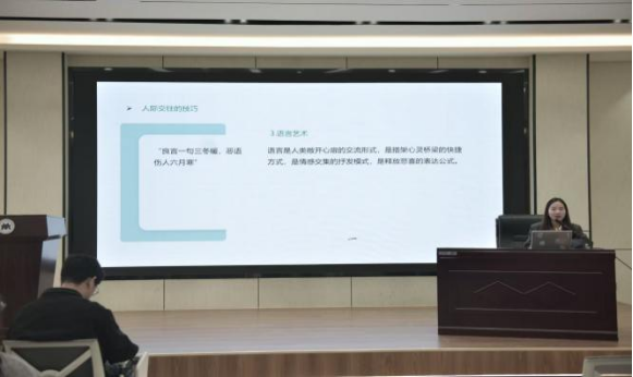 随后,老师结合大学生普遍存在的心理困惑,系统讲解了心理健康的核心标准:智力正常是正常生活与学习的基本前提,情绪健康要求保持愉悦开朗、积极乐观,意志健全需做到目标明确、坚韧自律、自制力强。同时,她结合大学生常见心理问题案例,分享了一系列实用的心理调适技巧,帮助同学们找到舒缓压力、调适心态的有效路径;还重点传授了注意倾听与语言艺术等人际交往技巧,提到倾听要全神贯注、耐心尊重,语言要温暖得体、真诚表达,让同学们学会用科学方法调节情绪、缓解压力。