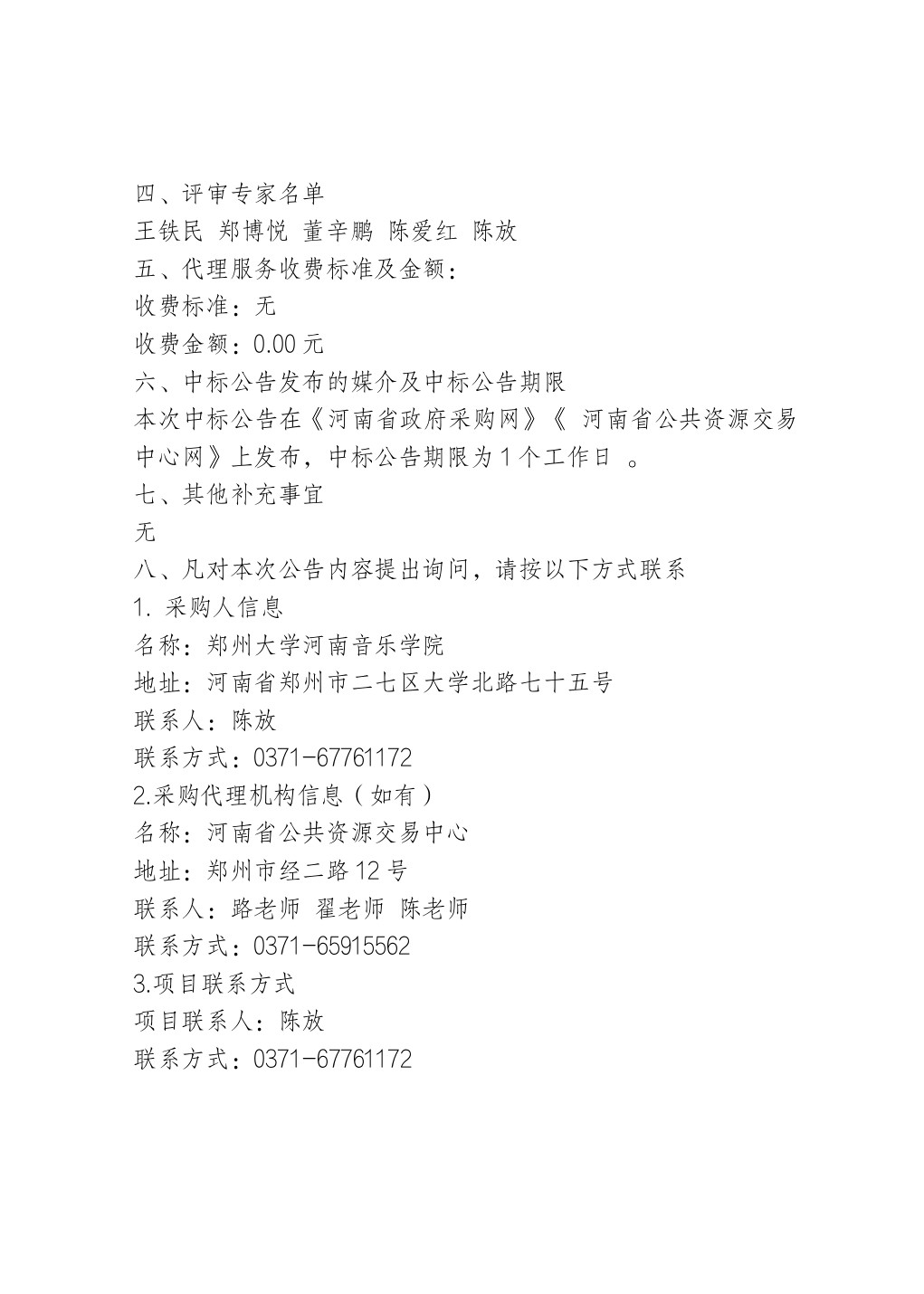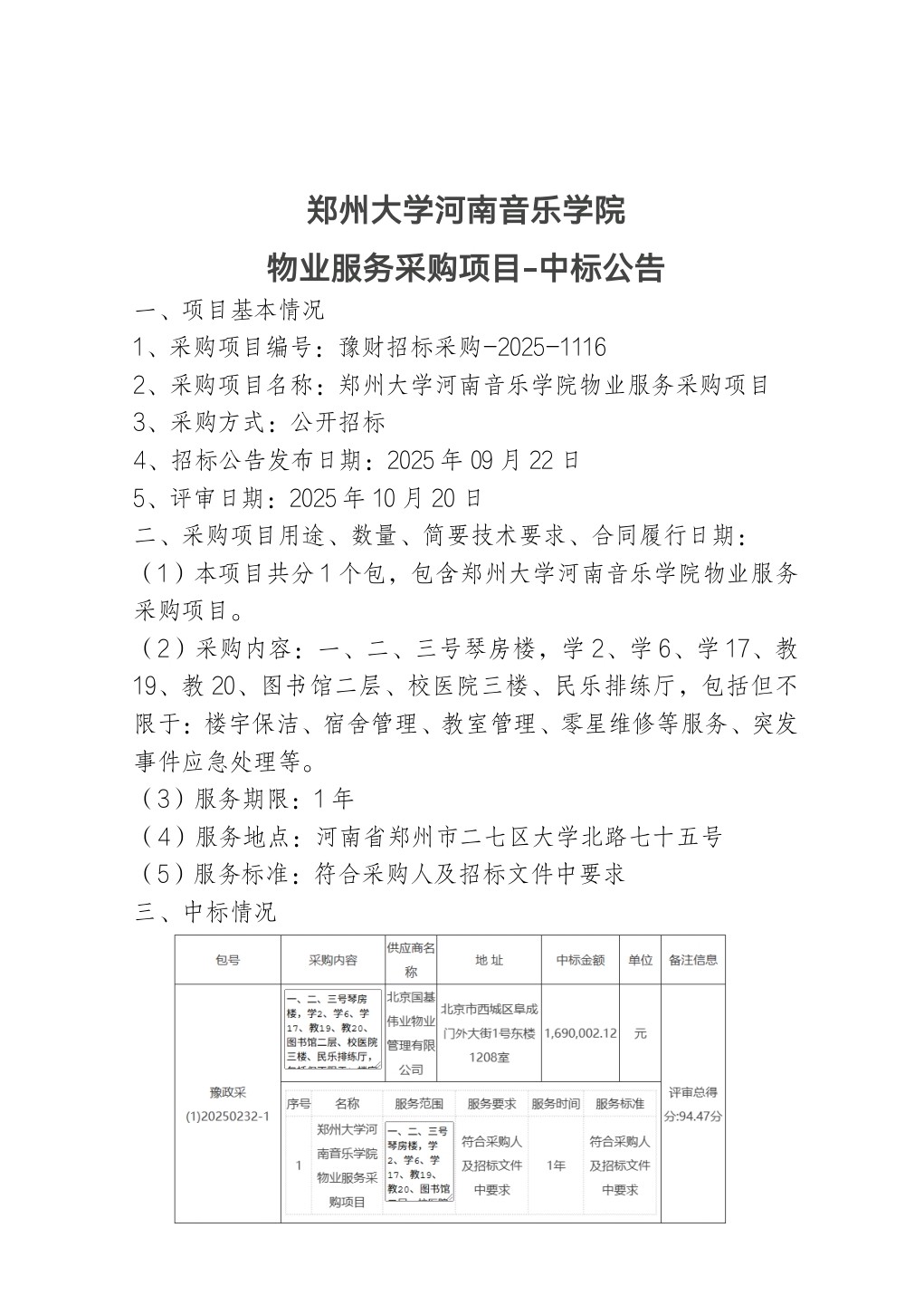 郑州大学河南音乐学院物业服务采购项目-中标公告
