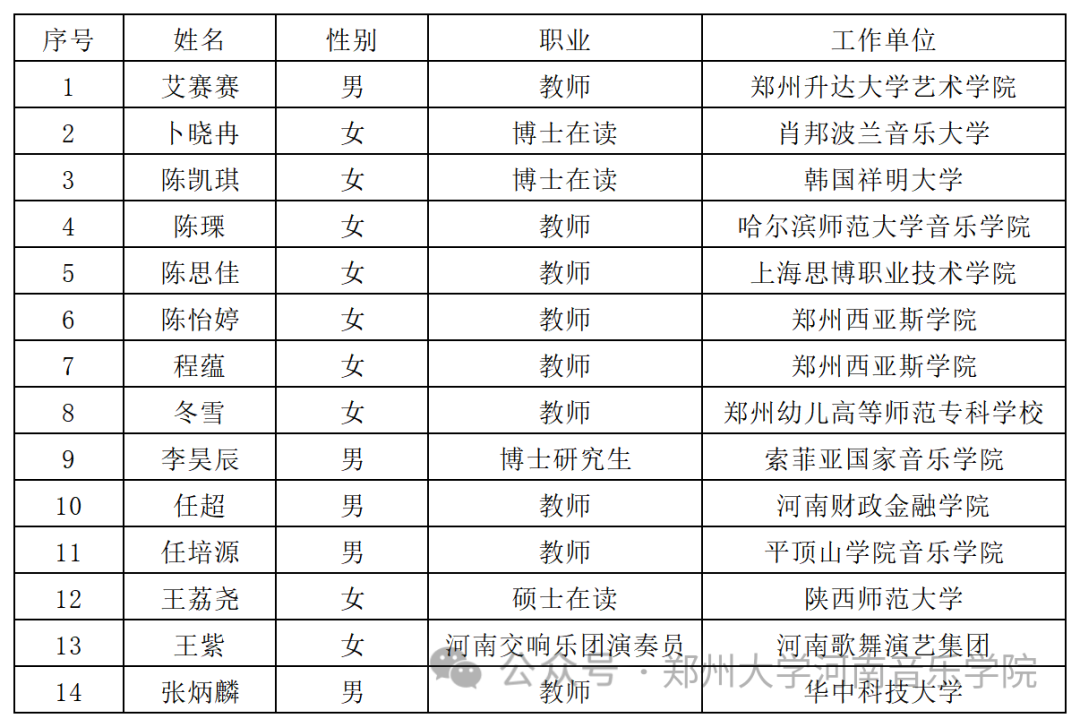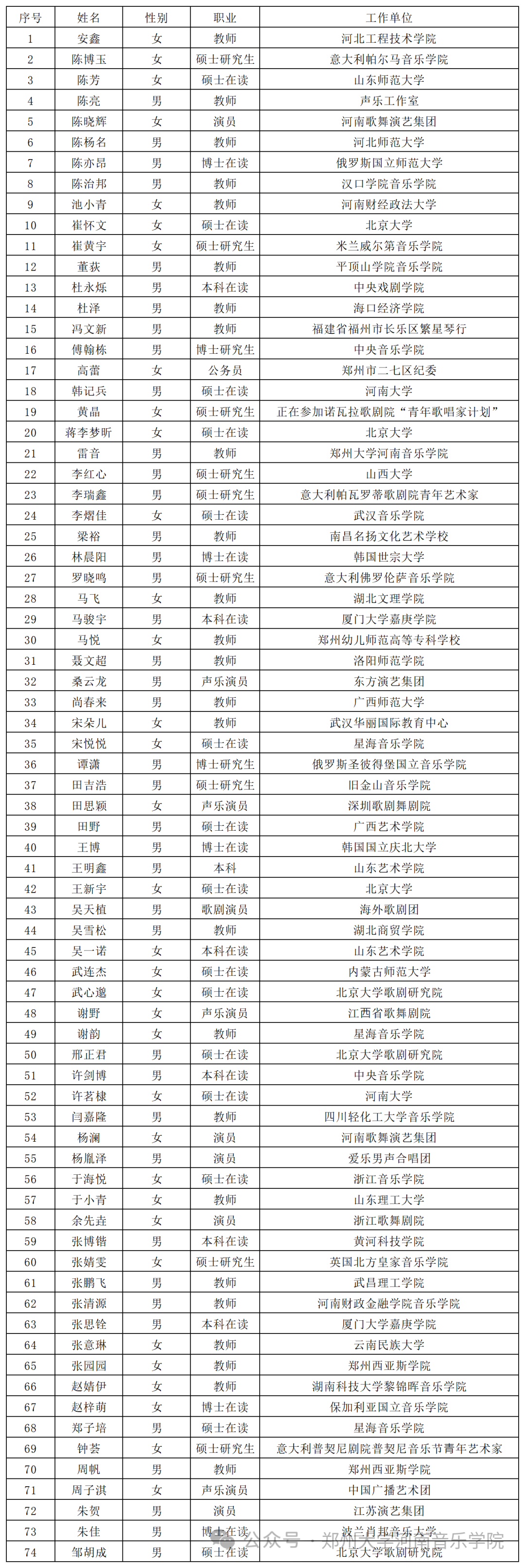 由河南省文化和旅游厅作为指导单位,郑州大学河南音乐学院、河南保利艺术中心管理有限公司、河南歌舞演艺集团主办,由河南省音乐家协会、河南省新的社会阶层人士联谊会协办的中国•河南首届外国歌剧演修班,自2023年11月28日发布招生简章以来,截至12月31日21:00,组委会共计收到来自全国32个省、市、自治区,以及部分海外及地区300余位学员的报名材料。经组委会组织导师团队认真审核,现发布正式学员名单。