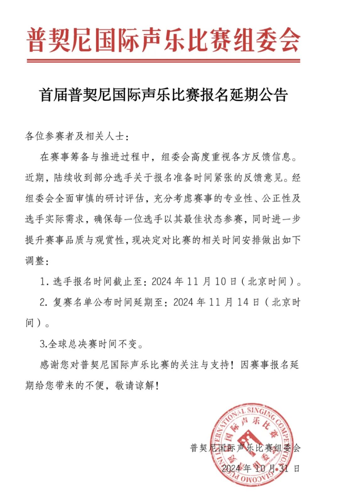 首届普契尼国际声乐比赛落户中国,这既源于普契尼大师对中国文化的热爱及传播,也体现了意方对发掘、培养优秀中国歌者的殷切期望。此次赛事为中国歌者搭建了一个通向世界的舞台,鉴于报名时间较为紧张,组委会决定延长报名时间,详情见下文: