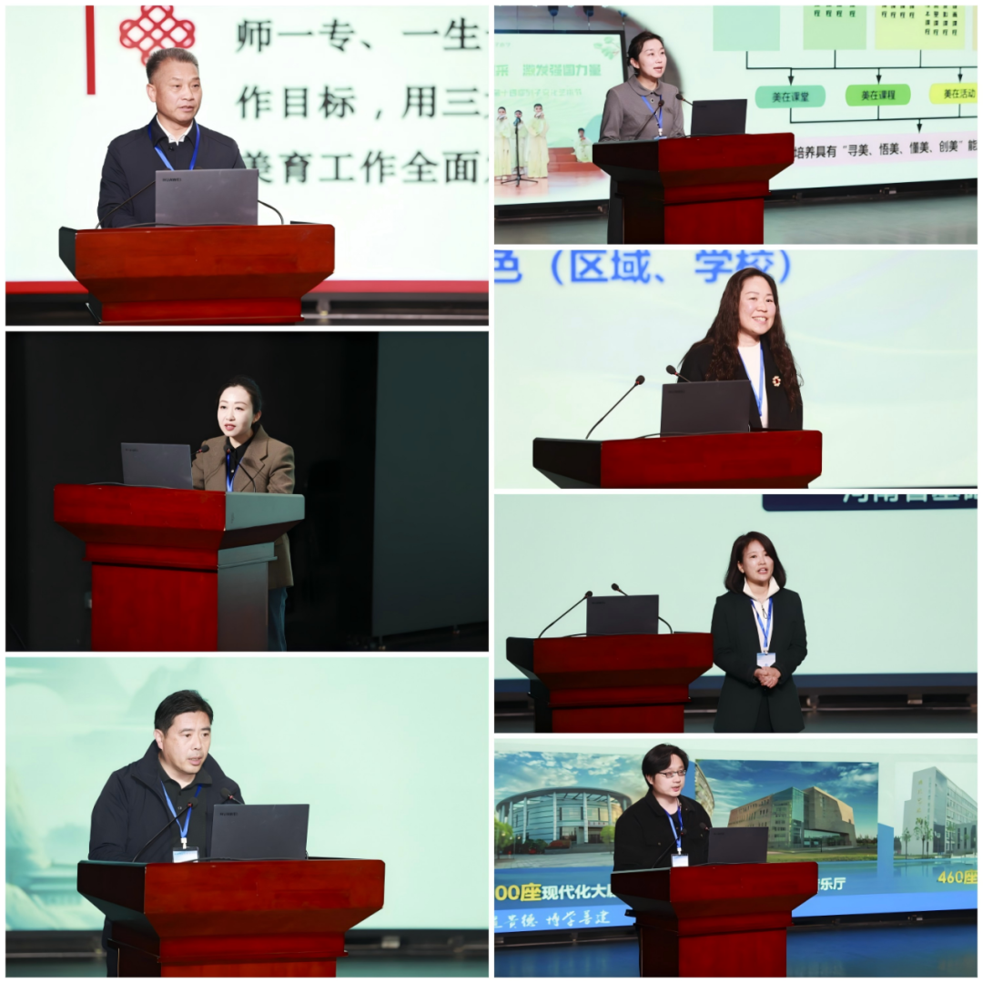 新乡市教育局党组成员、副局长冯建,开封市教育科学研究院义务教育研究所副主任宋瑞敏,濮阳市教育局体卫艺科副科长王献科,郑州经济技术开发区教文体局党委委员周旭锦,洛阳市教师发展中心艺术专干马莲花,河南省美育教指委委员、河南省基础教育课程与教学发展中心音乐教研员郑小艳,周口师范学院音乐舞蹈学院院长范明磊先后作经验交流。
