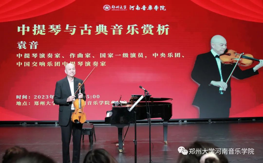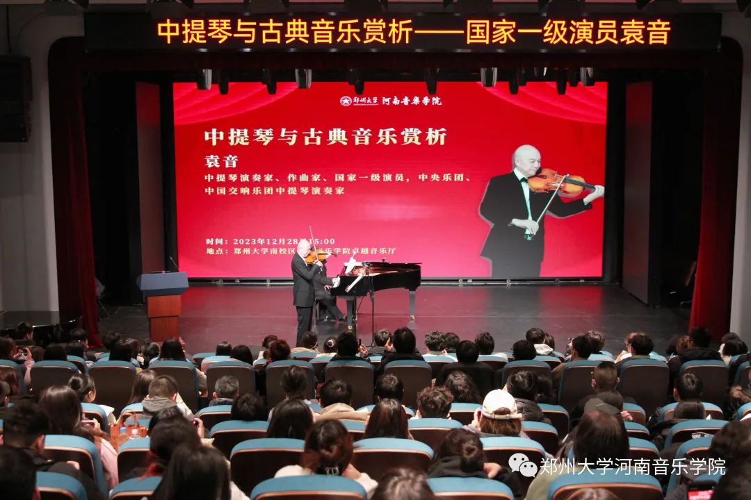 2023年12月28日15时,中提琴演奏家、作曲家、国家一级演员,中央乐团、中国交响乐团中提琴演奏家袁音先生应邀来到郑州大学河南音乐学院卓越音乐厅,举办了一场中提琴与古典音乐赏析演奏交流分享会。当日现场座无虚席,反响热烈。