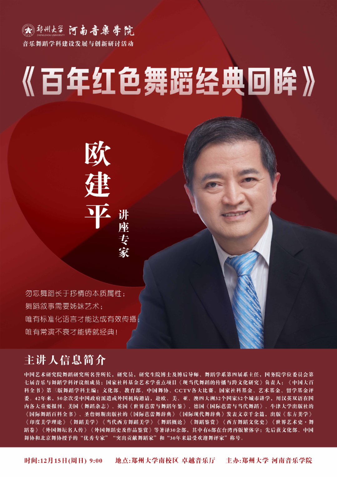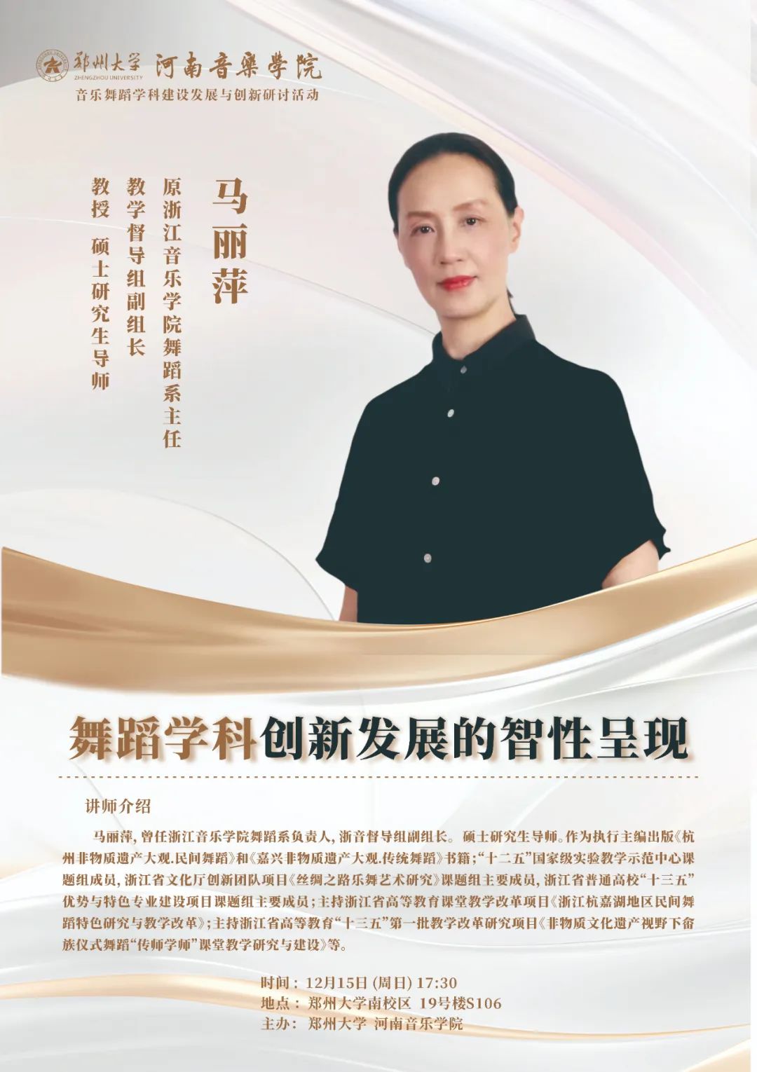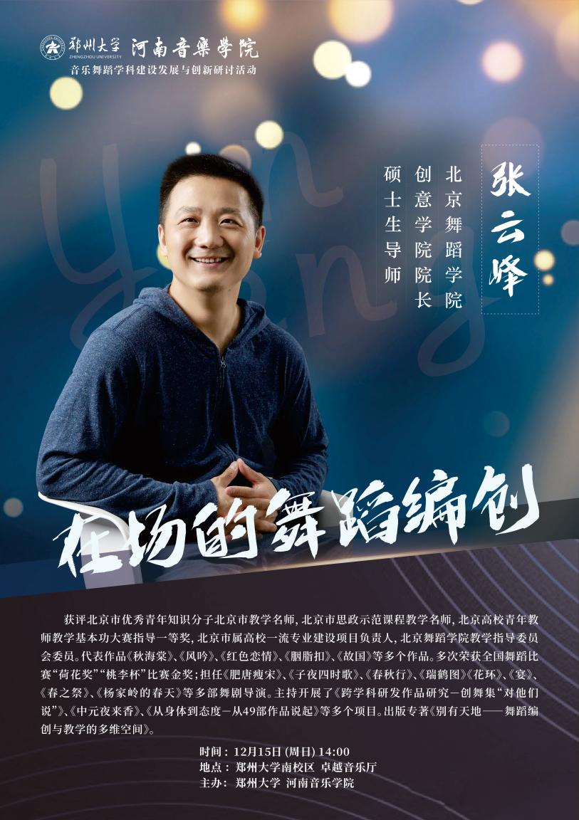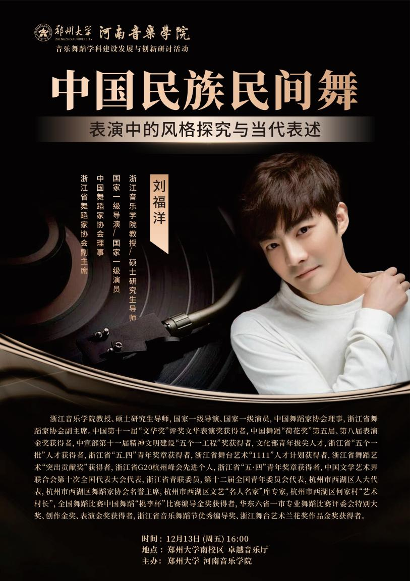12月13日—16日,欧建平教授、张云峰教授、马丽萍教授、刘福洋教授在郑州大学河南音乐学院讲授大师课、开展学术讲座,从理论建构、理念革新、范式创新、实践经验等方面为师生开拓视野、提升认知,助力舞蹈学科创新发展。