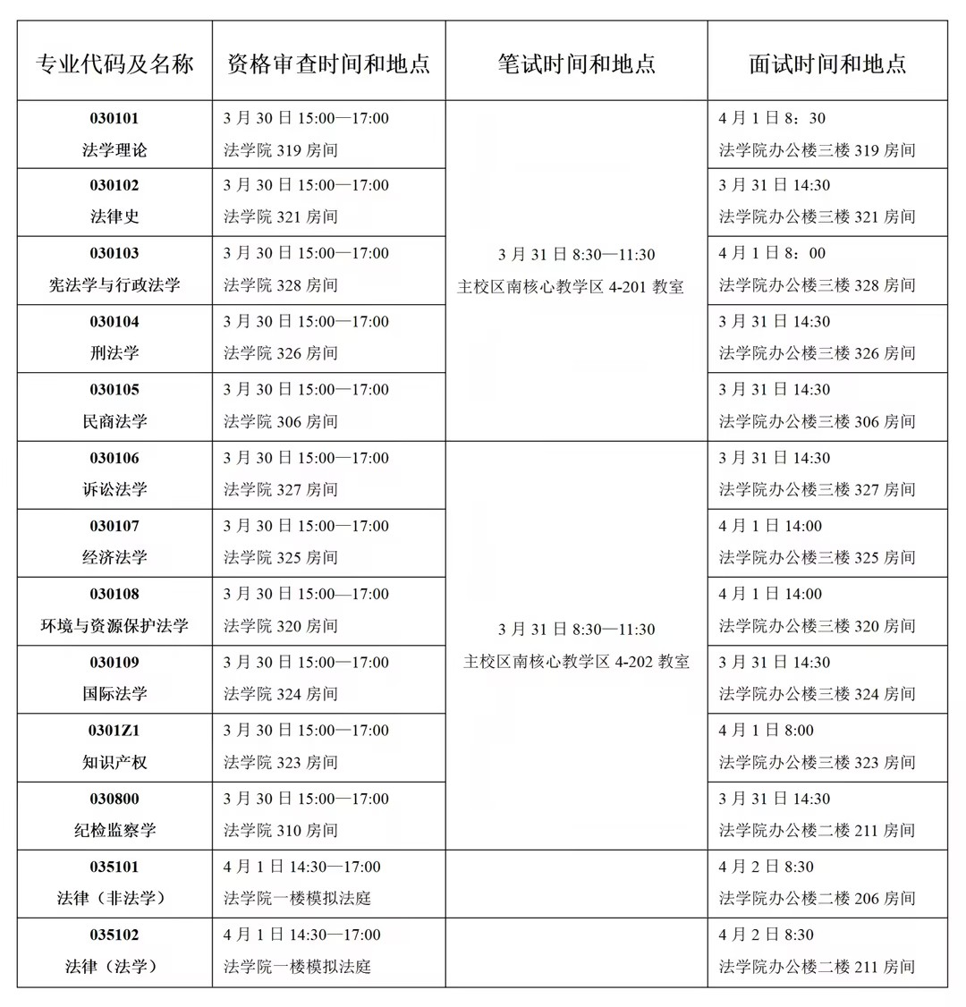 法学学术学位各专业复试考生,于2026年3月30日下午15:00,携带下列资格审查资料原件及复印件,前往上表中地点进行现场审核。