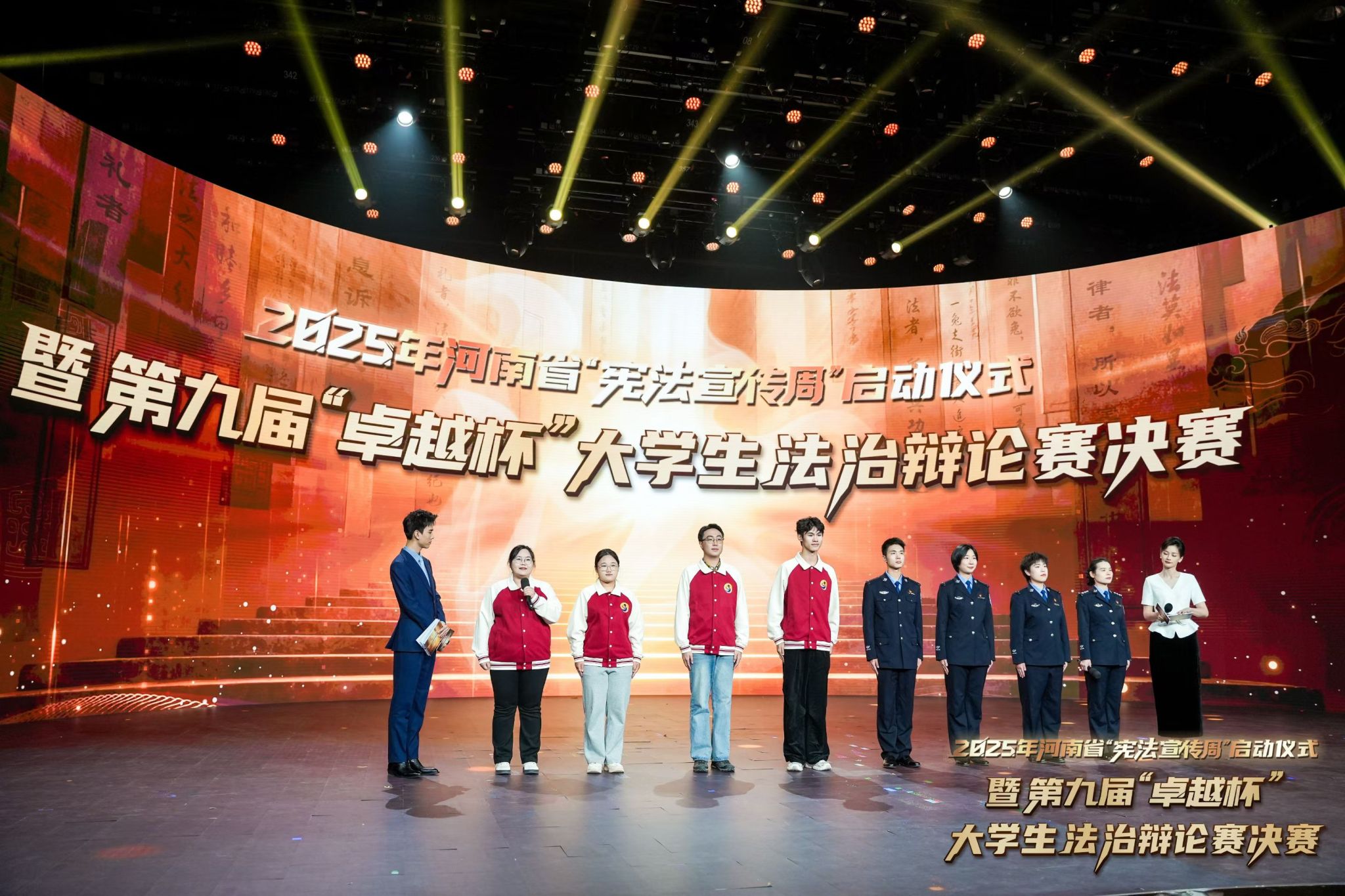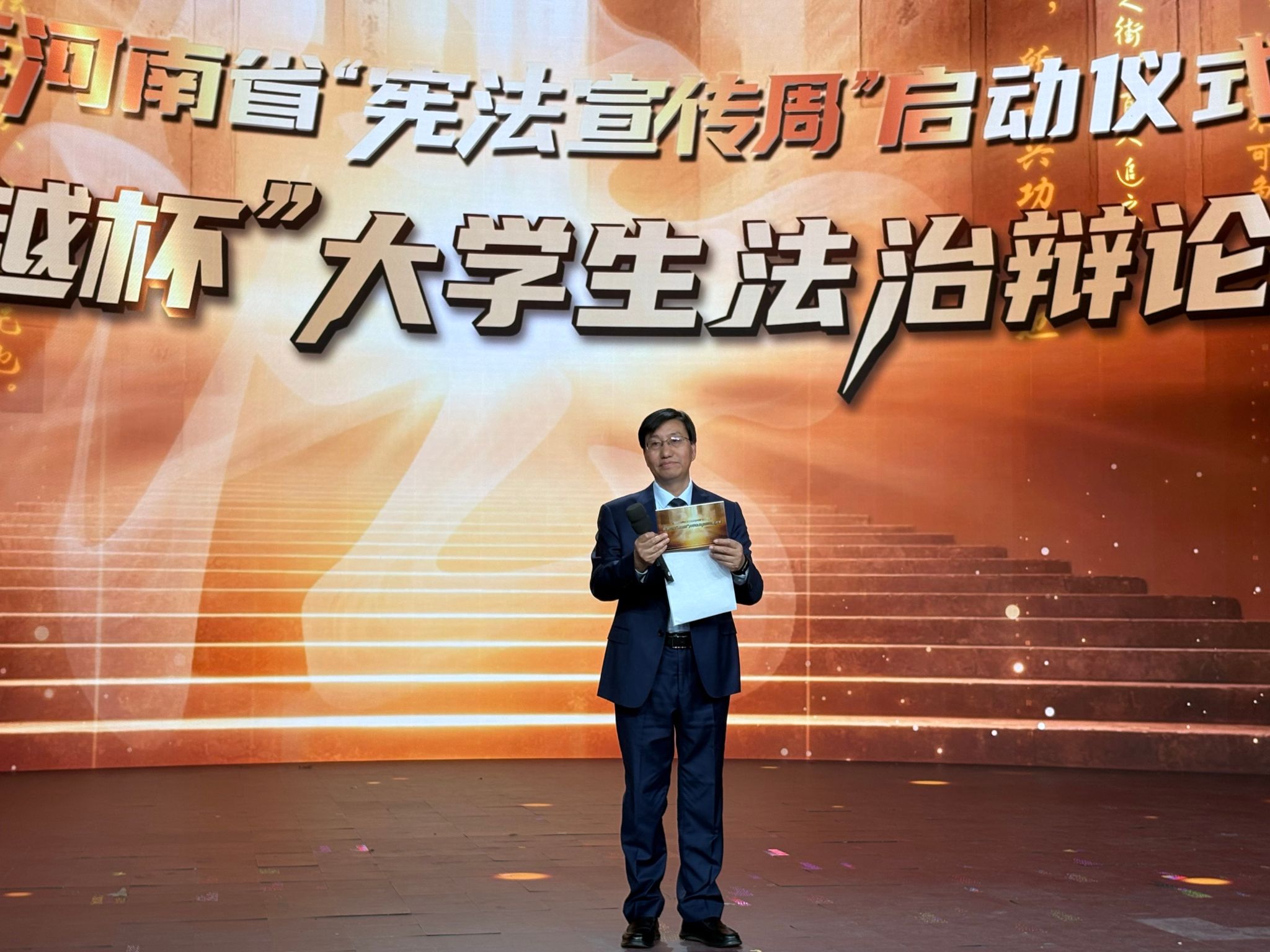2025年12月1日,河南省“宪法宣传周”启动仪式暨第九届“卓越杯”大学生法治辩论赛决赛在河南广播电视台举行并完成节目录制。郑州大学法学院党委书记张嘉军受邀担任决赛评委,郑州大学大学生法治宣讲团旗下“法趣”公益普法团队一同参与启动仪式。