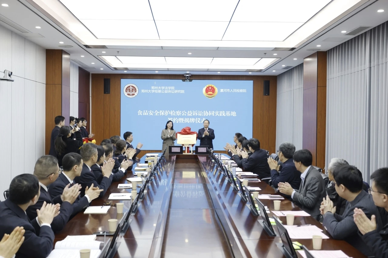 为深化检校合作、推动检察公益诉讼理论与实践深度融合,12月15日,郑州大学法学院、检察公益诉讼研究院与漯河市人民检察院举行签约揭牌仪式,正式成立“食品安全检察公益诉讼协同实践基地”。郑州大学党委常委、纪委书记、监察专员陈曦,漯河市人民检察院党组书记、检察长杜永召共同为基地揭牌。漯河市人民检察院党组副书记、常务副检察长陈军与郑州大学法学院党委书记、检察公益诉讼研究院院长张嘉军教授代表双方签署合作协议。河南省人民检察院检察委员会专职委员李红伟,郑州大学检察公益诉讼研究院研究员姚保松,检察公益诉讼研究院办公室主任沈思达,检察公益诉讼研究院研究员苏炜杰、吕行,漯河市人民检察院班子成员、各部门负责人、各县区人民检察院检察长及公益诉讼部门负责人出席仪式。