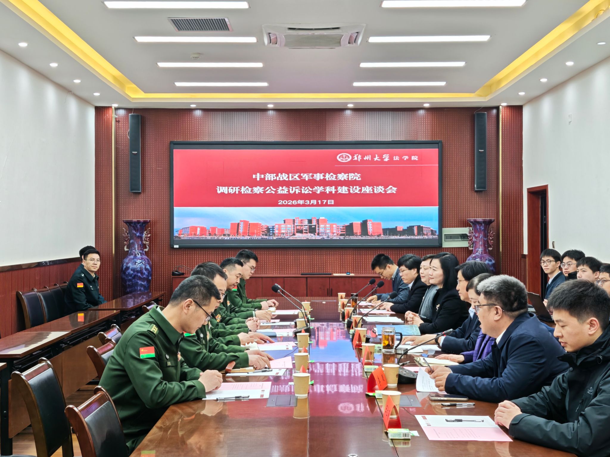 3月17日上午,中部战区军事检察院检察长孔凡明、第四检察处处长赵彦陶、郑州军事检察院检察长魏京哲等一行来我院走访调研,双方共同召开涉军公益诉讼理论研究座谈会。郑州大学党委常委、纪委书记、监察专员陈曦出席座谈会,法学院党政领导班子、部分师生代表参加座谈会。座谈会由郑州大学法学院副院长李朝主持。