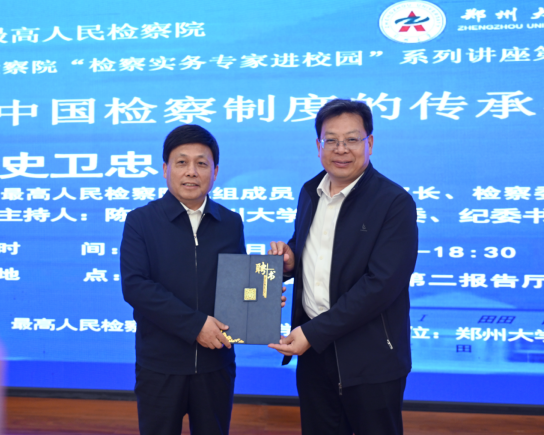 郑州大学党委书记李成伟会见了史卫忠副检察长一行,对最高人民检察院“检察实务专家进校园”走进郑州大学表示诚挚欢迎与衷心感谢。郑州大学党委副书记王利国代表学校向史卫忠副检察长颁发授课证书,感谢其对母校法学教育事业发展的热忱支持与深情回馈。史卫忠副检察长是郑州大学1987级本科生、1991级第一届刑法学硕士研究生。他深情回顾了在母校的求学时光,感恩母校的培养与教诲,并代表最高人民检察院对郑州大学长期以来在检察人才培养、理论研究、学科建设等方面给予检察事业的大力支持表示感谢,充分肯定法学院及检察公益诉讼研究基地的建设成效,对母校未来发展致以美好祝愿。他表示,将持续推动最高人民检察院与郑州大学在更宽领域、更深层次开展务实合作,共同促进新时代检察事业与法学教育事业繁荣进步。