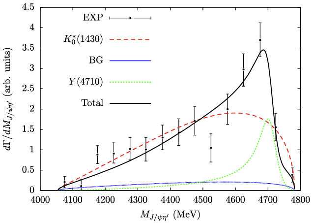 最近,BESIII合作组在正负电子对撞实验中观测到了新的类粲偶素Y(4710),但对于其性质理论上存在多种解释。我院粒子物理研究所提出利用底介子弱衰变过程B->Jpsi eta' K,系统研究了Y(4710)的奇特性质。本工作首次在该过程中同时考虑了S波矢量介子-矢量介子相互作用所产生的K(1430)共振态以及中间态Y(4710)的贡献,并分别计算了Jpsi K, Jpsi eta'和eta'K的不变质量谱及其对应的Dalitz分布。本研究指出,Y(4710)可能在该过程中发挥关键作用,并提出可通过测量该过程的衰变分支比,有效区分Y(4710)是传统粲偶素还是结构更为复杂的奇特强子态。这一方法为理解Y(4710)的内在结构提供了新的理论依据和实验鉴别手段。
