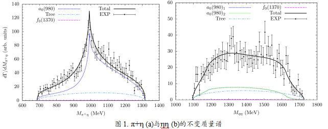 最近,BESIII合作组测量了衰变过程D+→π+ηη。我院粒子物理研究所在粲介子弱衰变过程D+→π+ηη中研究了轻标量介子a0(980)和f0(1370)的奇特性质。本工作通过考虑S波赝标介子-赝标介子相互作用产生共振态a0(980)以及中间态f0(1370)的贡献,分别分析了π+η和ηη不变质量谱上的信号(图1)以及相应的Dalitz分布(图2)。本工作指出轻标量介子f0(1370)与a0(980)的干涉可能在该过程起到重要作用。本工作对于理解粲强子的三体衰变过程反应机制,以及轻标量介子a0(980)和f0(1370)的性质具有重要意义。