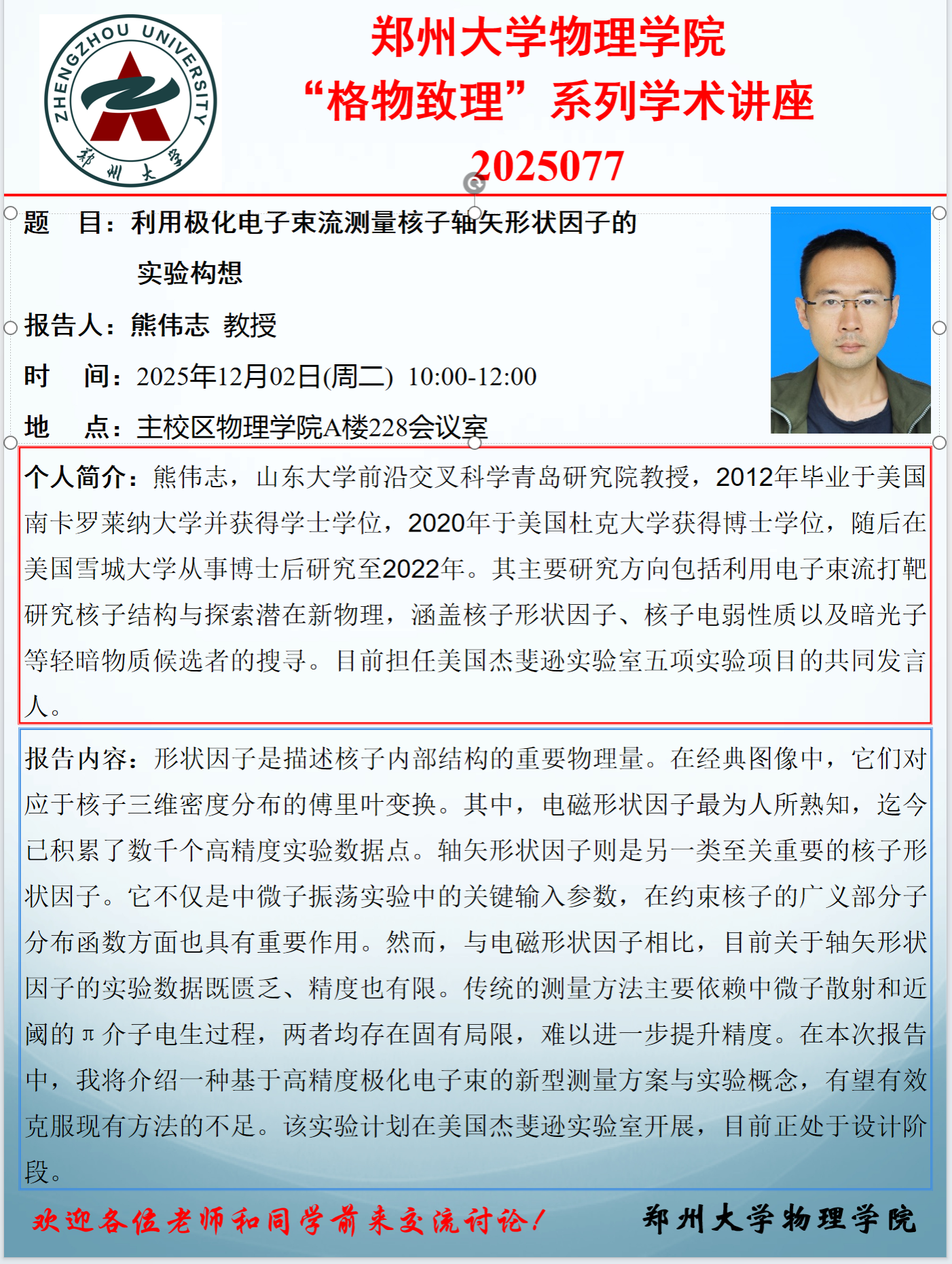 Copyright © 2020 郑州大学粒子物理核物理学科 All Right Reserved. 地址:郑州市科学大道100号 邮编:450001
