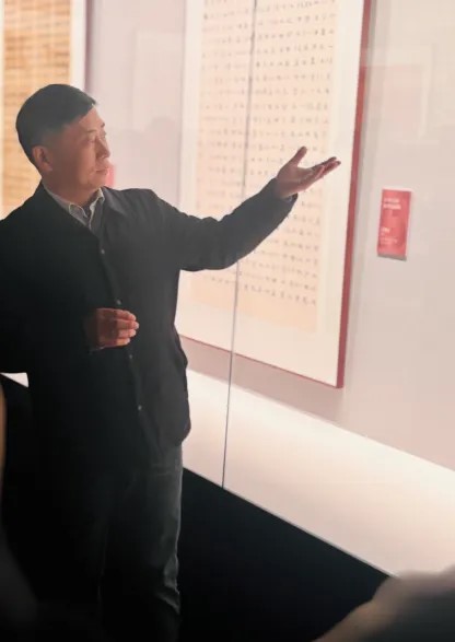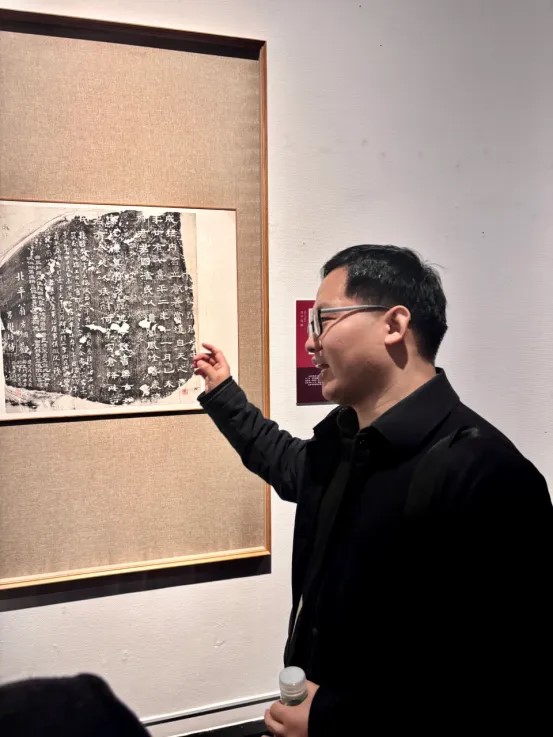 活动紧扣“传承经典・守正创新”核心主题展开。马健中老师对全国第五届隶书展的优秀作品进行了多维度的细致分析,从作品的笔法、墨法、章法形式到整体气息以及临创转换等都进行了详细的解读,使同学们对本次展览和隶书创作都有了更深层次的思考和理解。丁成东老师重点分析了隶书创作的用字问题和创作注意事项。在汉代文字刻石精粹特展厅,丁成东与温见涛老师对汉碑的形制特征、隶变问题做了专业讲解,选取代表性作品从用笔特征、风格演变展开细致讲解。丁老师还重点阐释了拓印方式对拓片艺术效果的影响,进一步拓展了同学们的专业视野,现场教学兼具理论深度与实践意义。