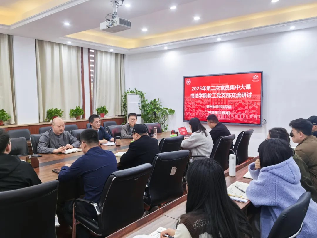 2025年11月3日,书法学院教工党支部举办支部党员大会暨第二次党员集中大课交流研讨会,学院党委书记杨祖轩及全院教工党员参会,会议由教工党支部书记张宏伟主持。