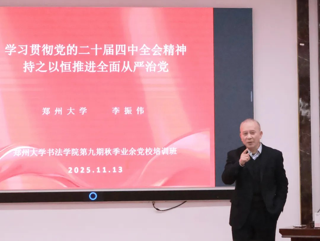 2025年11月13日下午,书法学院第九期秋季业余党校培训班开班仪式在三梦讲堂举行。郑州大学书法学院党委书记杨祖轩,原郑州大学纪委副书记李振伟出席开班仪式,书法学院2023级本科生辅导员成嘉豪、2024级本科生辅导员陈思成,以及入党积极分子、发展对象和预备党员共计71名培训学员共同参加。开班仪式由书法学院学工办主任朱梁梓老师主持。