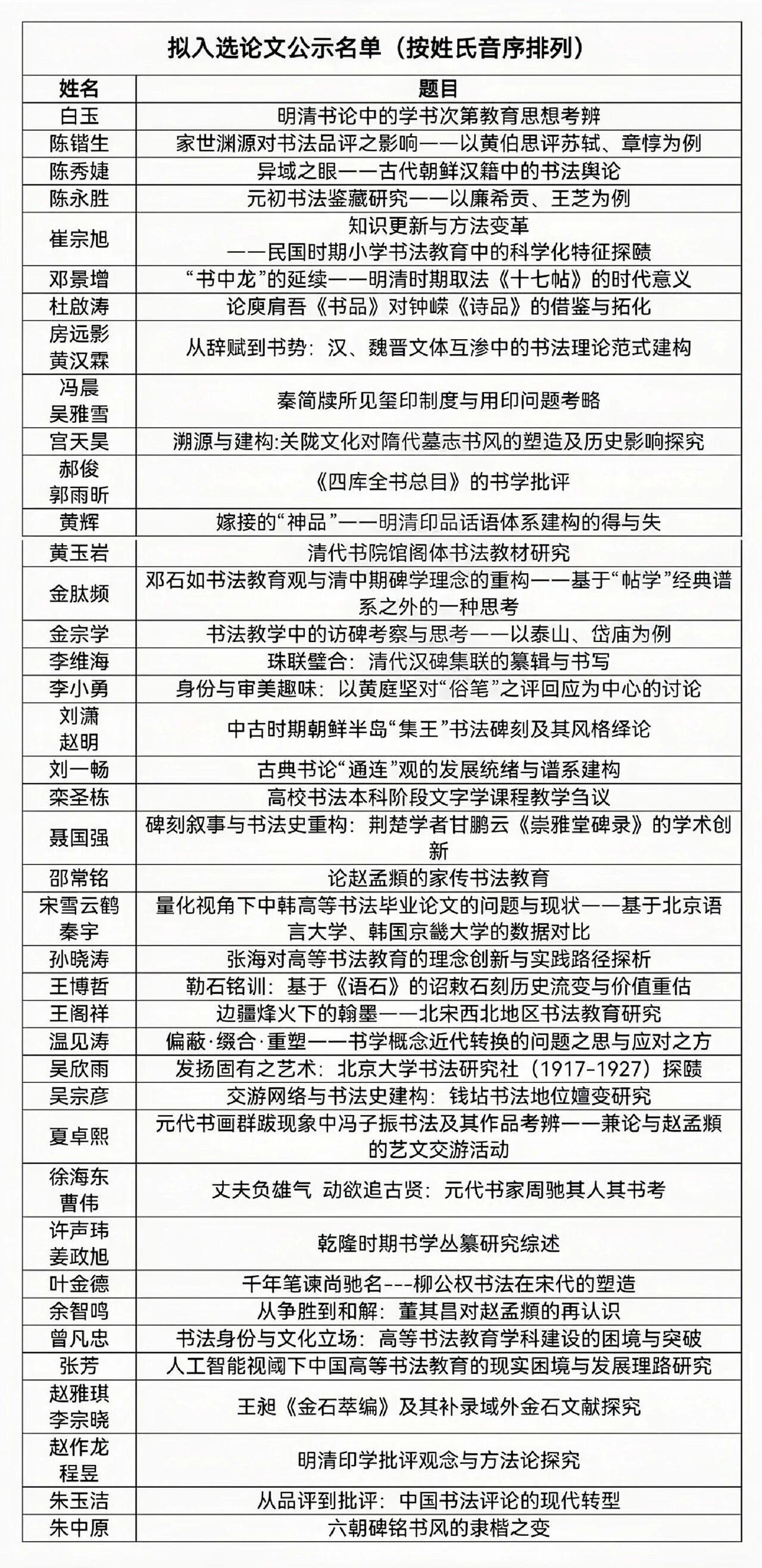 由教育部中国书法教育指导委员会主办的“全国书法教育学术研讨会”论文评审工作于日前圆满结束。本次研讨会共收到投稿论文174篇。经过评委严格评审,共评出入选论文40篇,现将评审结果予以公示。公示期为2025年9月12日至9月14日,共3天。公示期内,如发现存在抄袭、剽窃、代笔等学术不端行为者,可向本论坛组委会举报,举报材料要求信息准确、事实清楚。一经查实,立即取消该论文的入选资格。