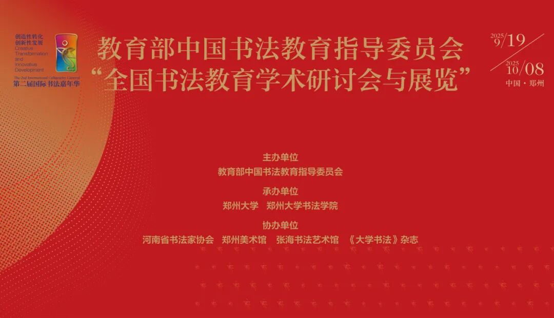 9月20日,由教育部中国书法教育指导委员会主办、郑州大学承办的首届“全国书法教育学术研讨会与展览”在郑州开幕。教育部中国书法教指委主任委员丁向阳,中国文联党组成员、书记处书记、中国书法家协会分党组书记、驻会副主席李昕,教育部原国家副总督学郭振有,河南省教育厅党组成员、副厅长杨光,郑州大学党委书记李成伟,中国书法家协会副主席叶培贵、潘善助,原中国书法家协会分党组副书记、秘书长郑晓华等出席开幕式。郑州大学书法学院师生代表,以及来自全国高校的书法教育专家共150余人参加活动。开幕式由教育部体卫艺司一级巡视员、中国书法教指委副主任兼秘书长郝风林主持。