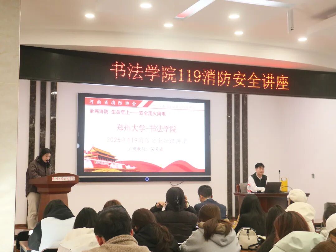 隐患险于明火,防范胜于救灾。正值“119消防宣传月”,为进一步增强学院师生的消防安全素质和抵御灾害的能力,围绕全民消防、生命至上、安全用火用电为主题。2025年11月26日下午三点,郑州大学书法学院联合河南省消防协会义务消防科普宣传服务队,特邀服务队吴昊森教员,开展此次消防安全专项培训及演练活动。书法学院党委书记杨祖轩、全体辅导员老师、部分教职工和2025级全体新生共同参加。