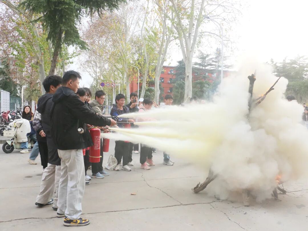 随后,在吴教员和学院老师的带领下,由工作人员点燃模拟火源,吴教员讲解灭火器的打开以及使用方式,并进行了亲身示范。