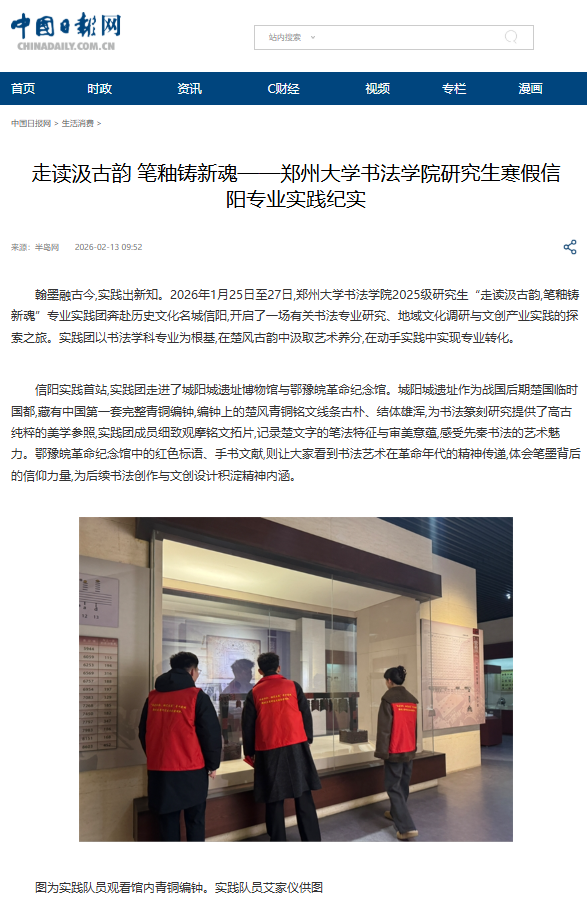 翰墨融古今,实践出新知。2026年1月25日至27日,郑州大学书法学院2025级研究生“走读汲古韵,笔釉铸新魂”专业实践团奔赴历史文化名城信阳,开启了一场有关书法专业研究、地域文化调研与文创产业实践的探索之旅。实践团以书法学科专业为根基,在楚风古韵中汲取艺术养分,在动手实践中实现专业转化。