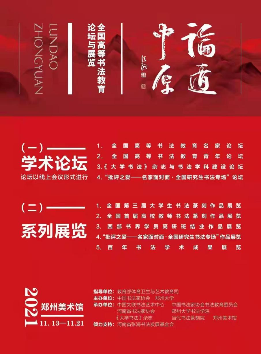 2021年11月,举办院庆五周年“论道中原——全国高等书法教育论坛与展览”系列活动,包括承办中国书协“全国第三届大学生书法篆刻展”,主办全国首届高校教师书法展、百年书法学术成果展、全国书法教育名家论坛与青年论坛等9大活动。