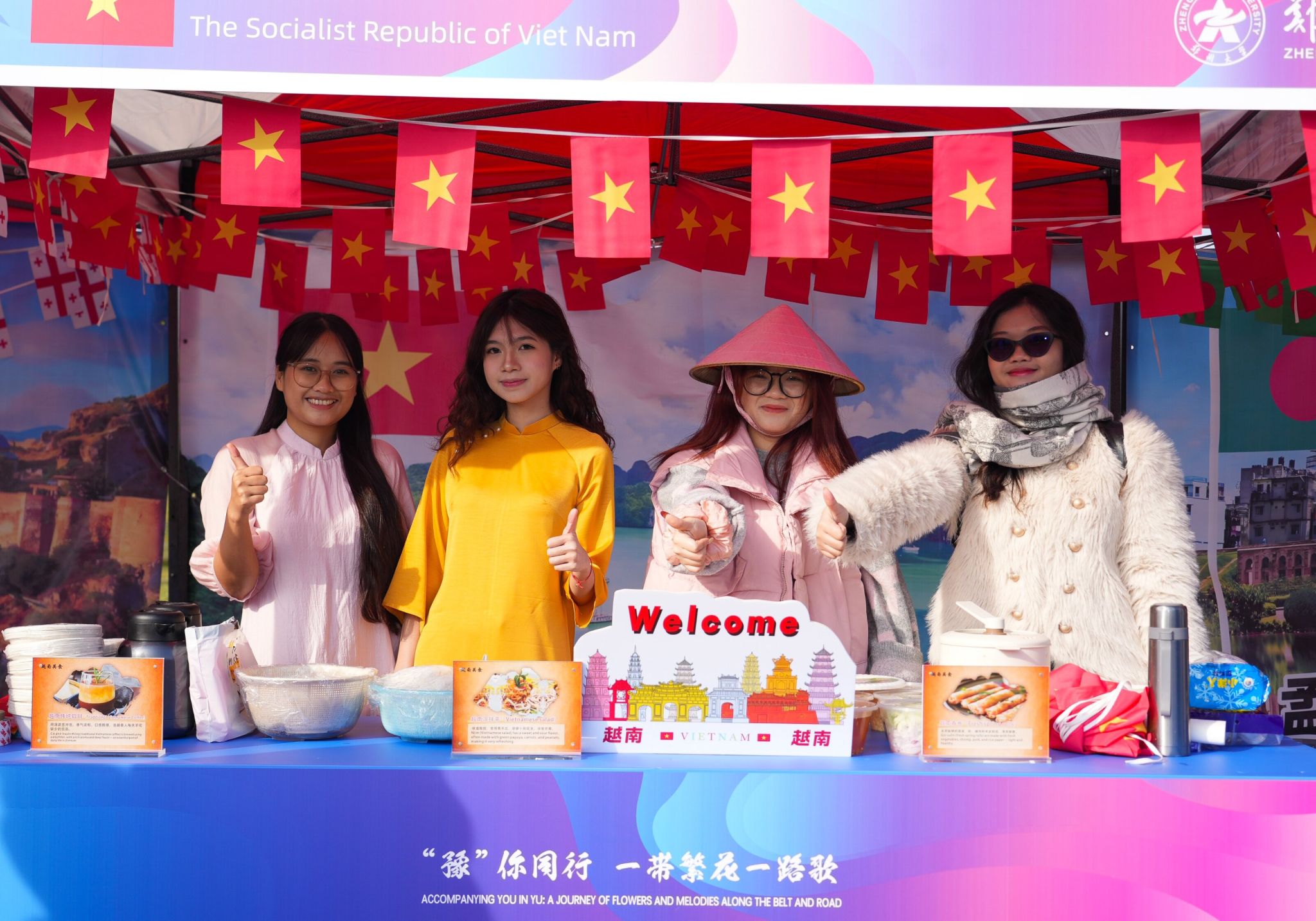 在上午进行的风情文化展和国际美食展过程中,中外师生人潮涌动,欢声笑语不绝于耳。我院设置的格鲁吉亚、津巴布韦、孟加拉国和越南展位前挤满了参观者。格鲁吉亚展位的葡萄酒文化体验别具特色,津巴布韦展位的非洲鼓表演节奏激昂,孟加拉国展位的本土美食令人驻足,越南展位的特色美食备受青睐。四个展位通过手工制品、民族服饰、本土美食和饮品,生动展示了各自国家的文化魅力。