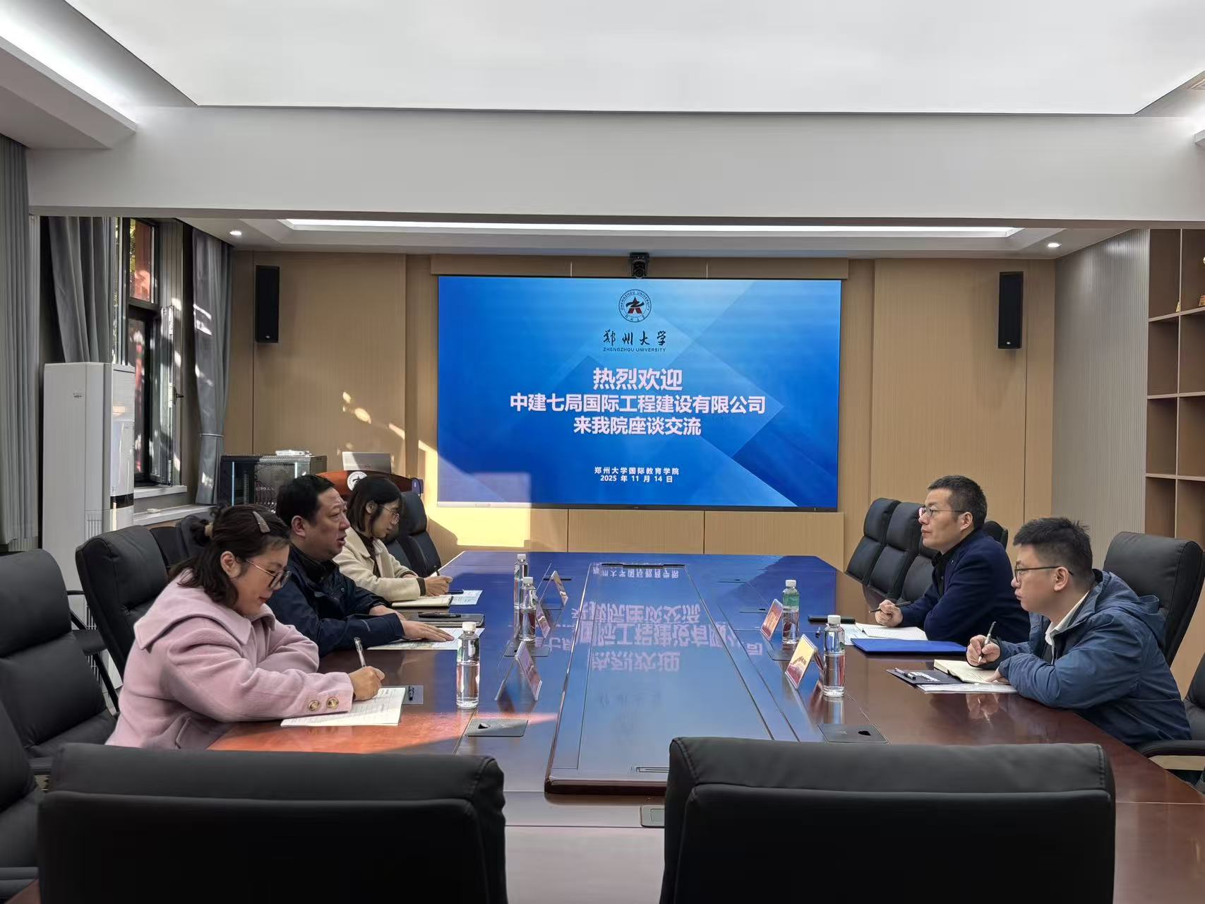 座谈会开始后,程果首先代表我院向高志朋一行表示热烈欢迎,并详细介绍了郑州大学国际学生的总体情况。他指出,我校国际学生生源国别多、专业覆盖广、学历层次全;作为全校国际学生归口管理单位,我院在国际学生跨文化交流与社会实践方面积累了丰富经验,希望与企业共同探索国际化人才培养与就业对接新模式。随后,高志朋介绍了中建七局国际工程建设有限公司的发展概况与人才战略。他强调,公司始终将国际化人才队伍建设作为重点,通过海外高质量发展战略,持续增强全球发展的人才支撑能力。在讨论环节,双方商定将分阶段持续推进合作,既着眼学校国际化人才培养的长远布局,又重视当前企业急需的人才需求,共同助力国际学生职业发展与企业人才储备。