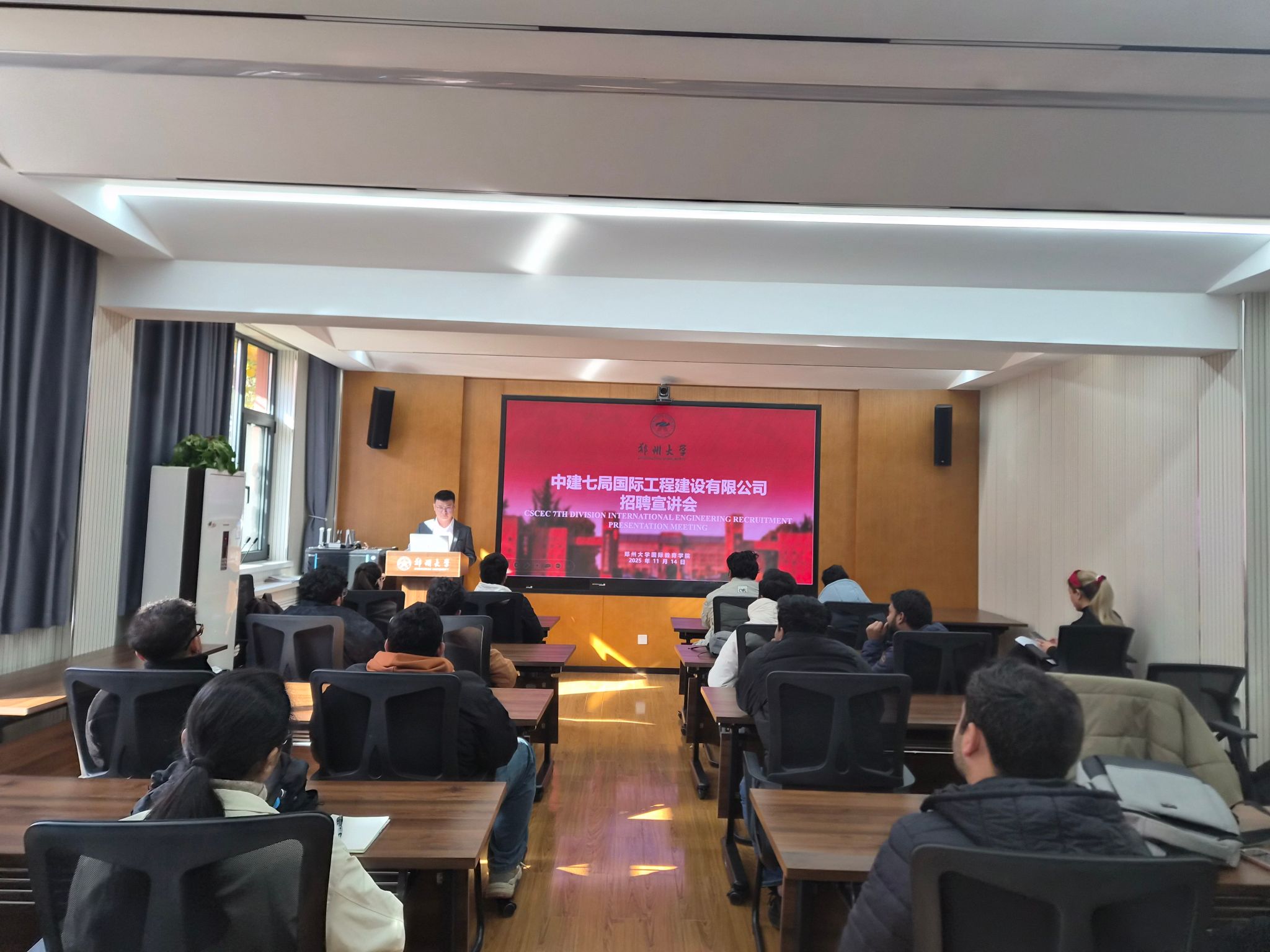 座谈会结束后,中建七局国际工程建设有限公司针对即将于明年毕业的部分国际学生开展了招聘活动。招聘活动包括公司介绍、现场讲解、互动交流三个主要环节。企业招聘负责人通过播放集团的宣传影片,使同学们对郑州中建七局的发展历程、企业文化、人力资源、工作环境和未来的发展方向等方面有了初步了解,同时还用详实的数据向同学们介绍了本次招聘的具体安排,包括招聘人数、工作内容、具体流程、面试中可能会遇到的问题等。在互动交流环节,同学们踊跃发言,企业招聘负责人耐心解答,现场气氛活跃,秩序井然。