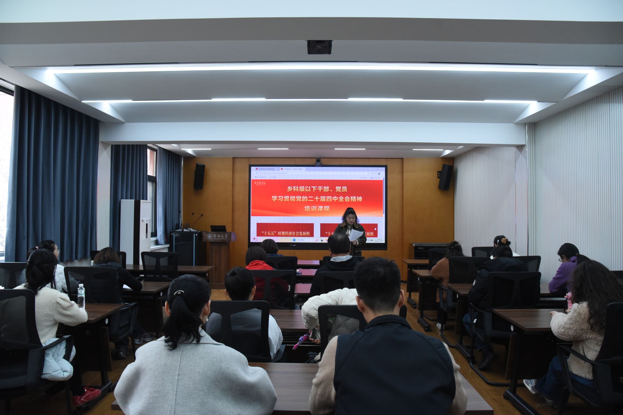 为深入学习贯彻党的二十届四中全会精神,切实把全院党员干部的思想和行动统一到全会决策部署上来,3月24日下午,我院开展了乡科级以下干部、党员学习贯彻党的二十届四中全会精神培训第一次集中学习,党总支组织委员、副院长张靖主持学习活动。