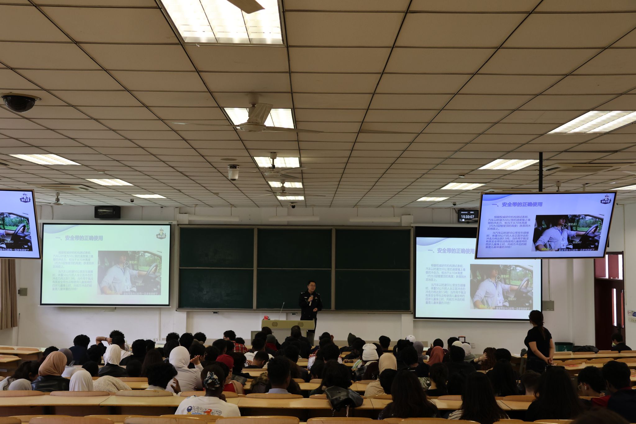 郑州市公安局交通管理局第十一支队赵方警官结合国际学生在校园及周边日常出行实际,系统讲解了我国道路交通安全相关法律法规。针对国际学生使用电动自行车高频出行的特点,重点解析了车辆合规上牌、骑行规范佩戴头盔、路口安全通行及转弯避让等实操要点。通过在现场播放真实事故视频案例,直观展示了未佩戴头盔、违规占道、忽视车辆视觉盲区等危险行为带来的安全隐患,以此引导国际学生自觉摒弃交通陋习,强化风险防范意识,做到文明骑行、安全出行。