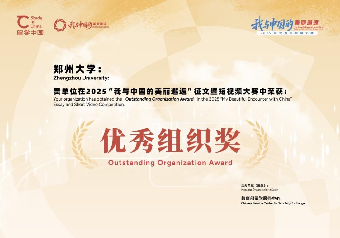 近日,由教育部留学服务中心主办的 2025“我与中国的美丽邂逅”征文暨短视频大赛结果揭晓。郑州大学凭借扎实高效的组织工作,荣获大赛优秀组织奖;我院巴基斯坦博士研究生高山(KHAN FAIZ AHMED)凭借优质突出的参赛作品,斩获征文类三等奖。
