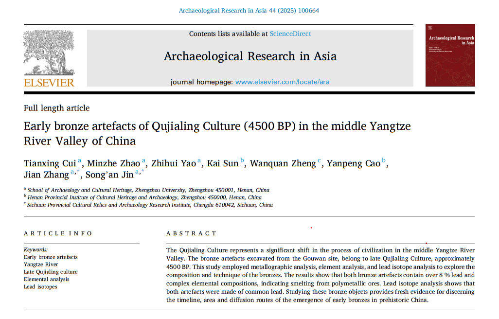 相关研究成果已在线发表于国际学术期刊《Archaeological Research in Asia》上,郑州大学考古与文化遗产学院崔天兴副教授为第一作者,张建副教授、靳松安教授为共同通讯作者,姚智辉教授和硕士研究生赵民喆以及河南省文物考古研究院曹艳朋研究员、孙凯副研究员、四川省文物考古研究院郑万泉副研究员为共同作者。