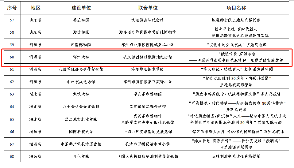 近日,教育部、国家文物局公布以中国人民抗日战争暨世界反法西斯战争胜利80周年为主题的大中小学“大思政课”优质资源建设推介项目名单,郑州大学联合巩义豫西抗日根据地纪念馆申报的“‘纸短情长 家国永念——中原英烈家书中的抗战精神’主题思政实践教学”获批精品项目,该项目也是我省本科高校唯一入选的推介项目。